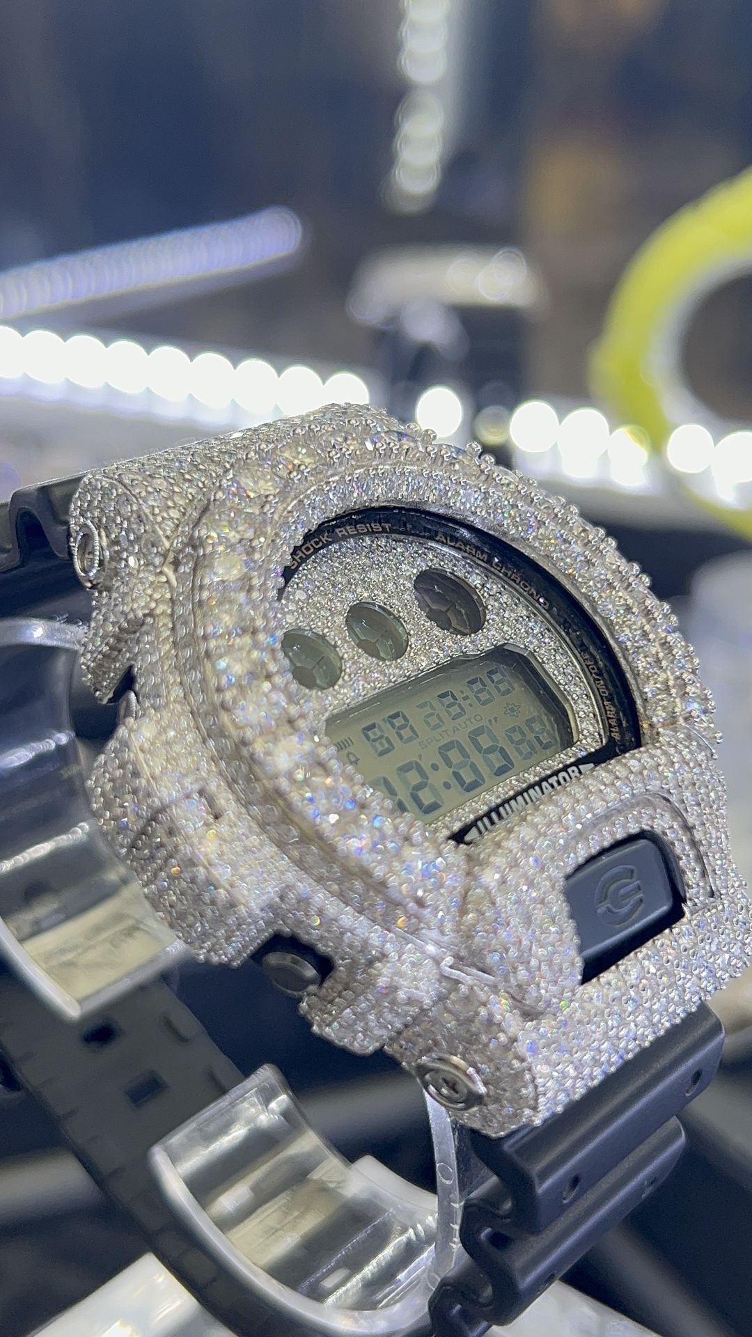 Moissanite watch they pass diamond test on them and comes with a lifetime warranty on it. We got a lot of options you can come and visit the Store pick the one that you like we can make you a good deal for you.