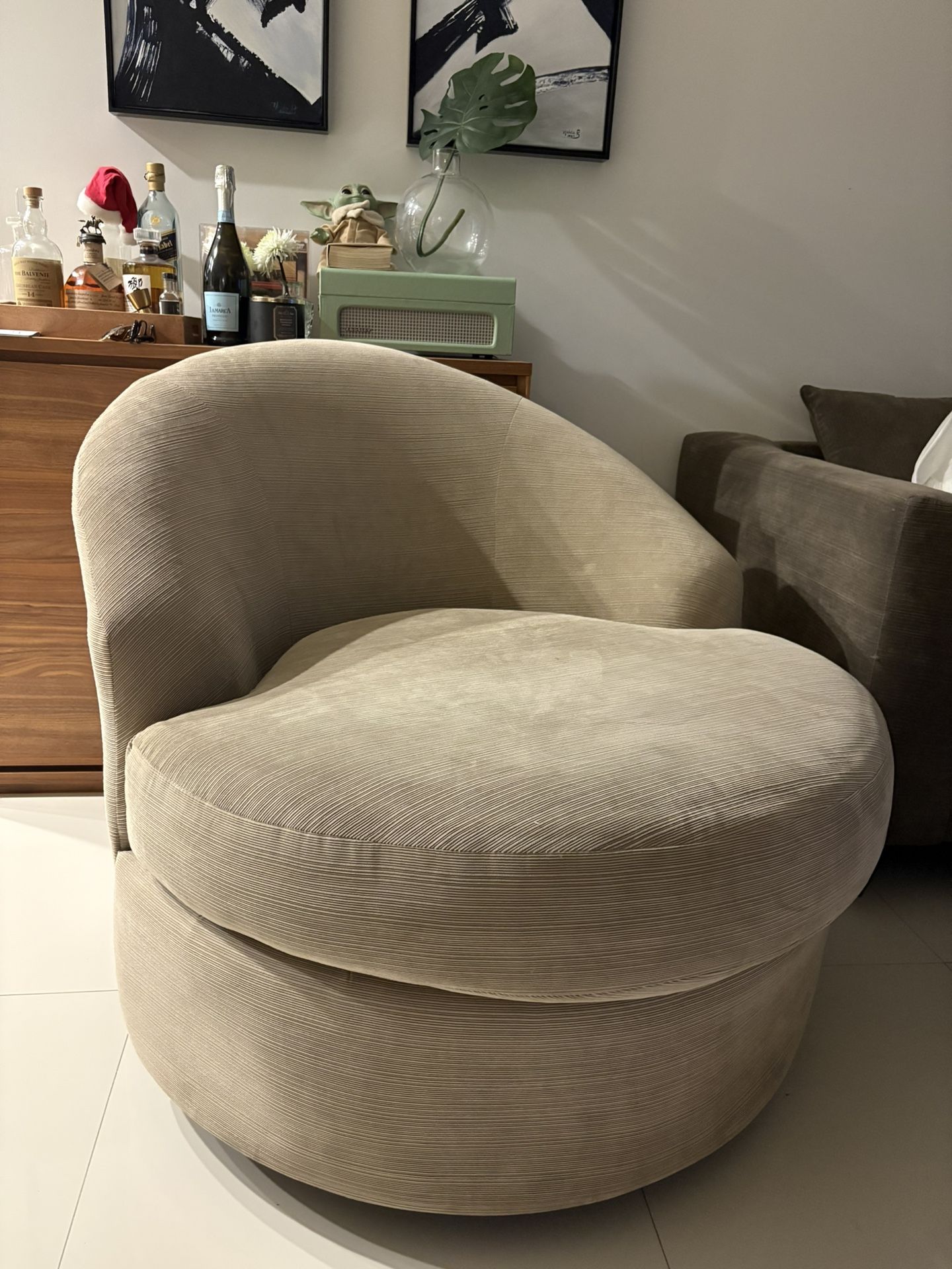 Large Swivel Armchair – Albany Industries (Rooms To Go) Condition: Excellent, gently used Color: Beige textured upholstery Features: Rounded barrel design, super comfortable, swivel base, perfect for living room or reading nook Dimensions: approx. 55” wide Made in USA with imported materials Original purchase: Rooms To Go