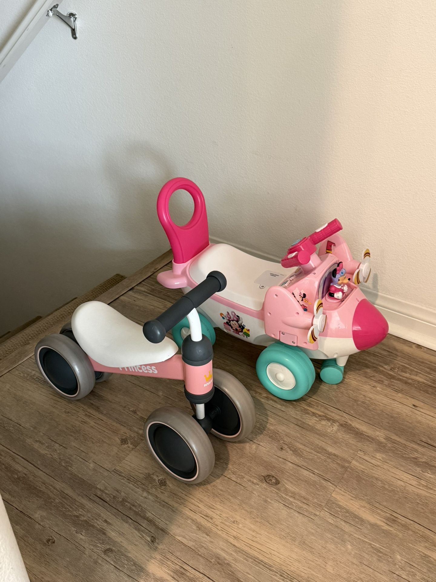 Adorable toddler ride-on bundle in great condition! Includes: • Pink toddler balance bike with 4-wheel stability (Princess theme) • Minnie Mouse ride-on toy with steering wheel and character details Both are sturdy, clean, and perfect for toddlers learning balance and coordination. Great indoor or outdoor toys. Selling as a bundle to save space as we’re preparing to move. 👉 Smoke-free home 👉 Ready for pickup