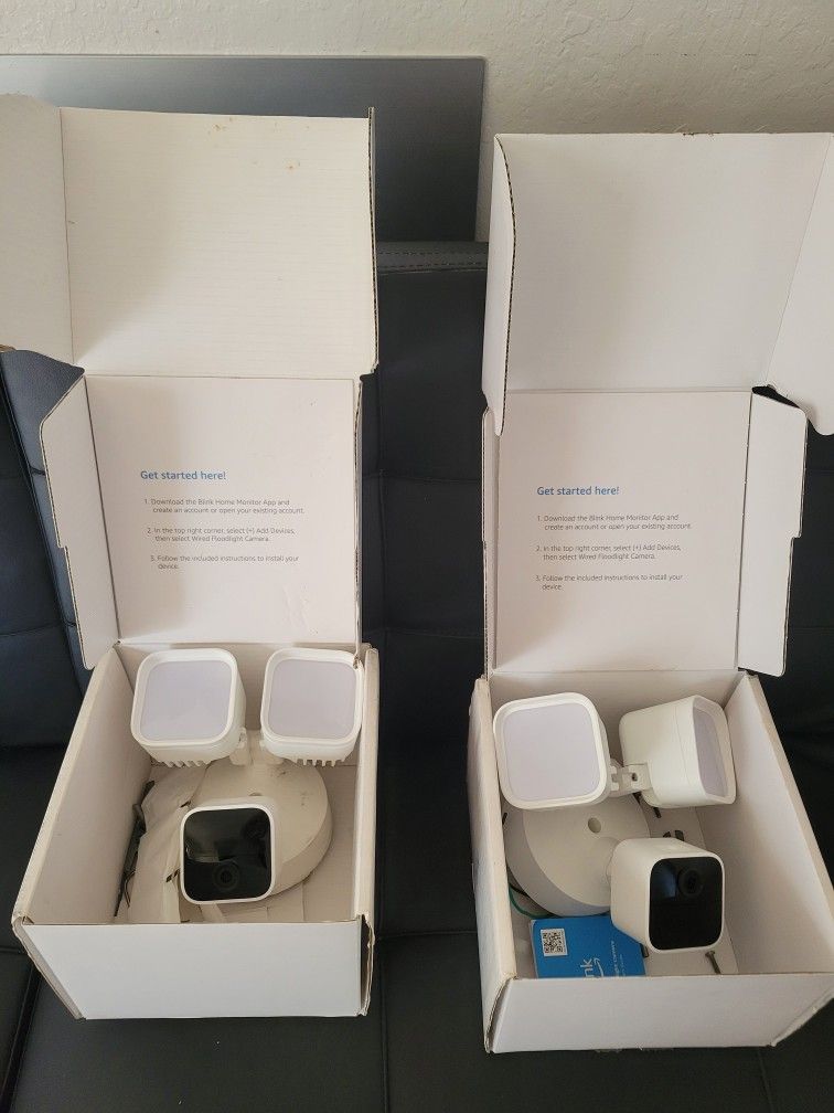 2 blink cameras. 1 new and 1 used. Features a 1080p HD security camera with two-way audio. Equipped with dual LED floodlights producing 2,600 lumens of brightness. Includes enhanced motion detection and a built-in siren. Retails for approximately $99.99 each