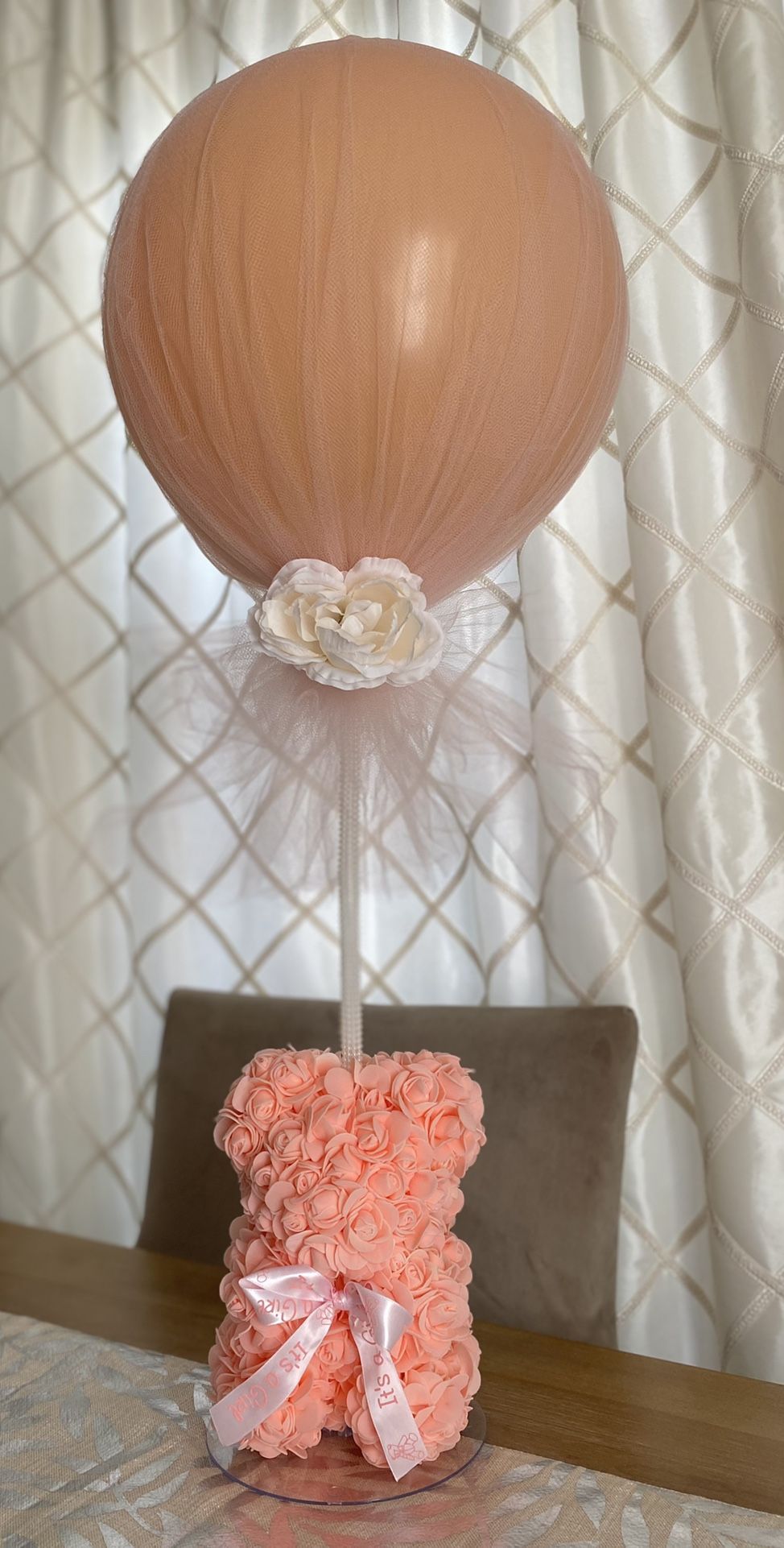Beautiful custom rose bear, tulle and ballon centerpieces.