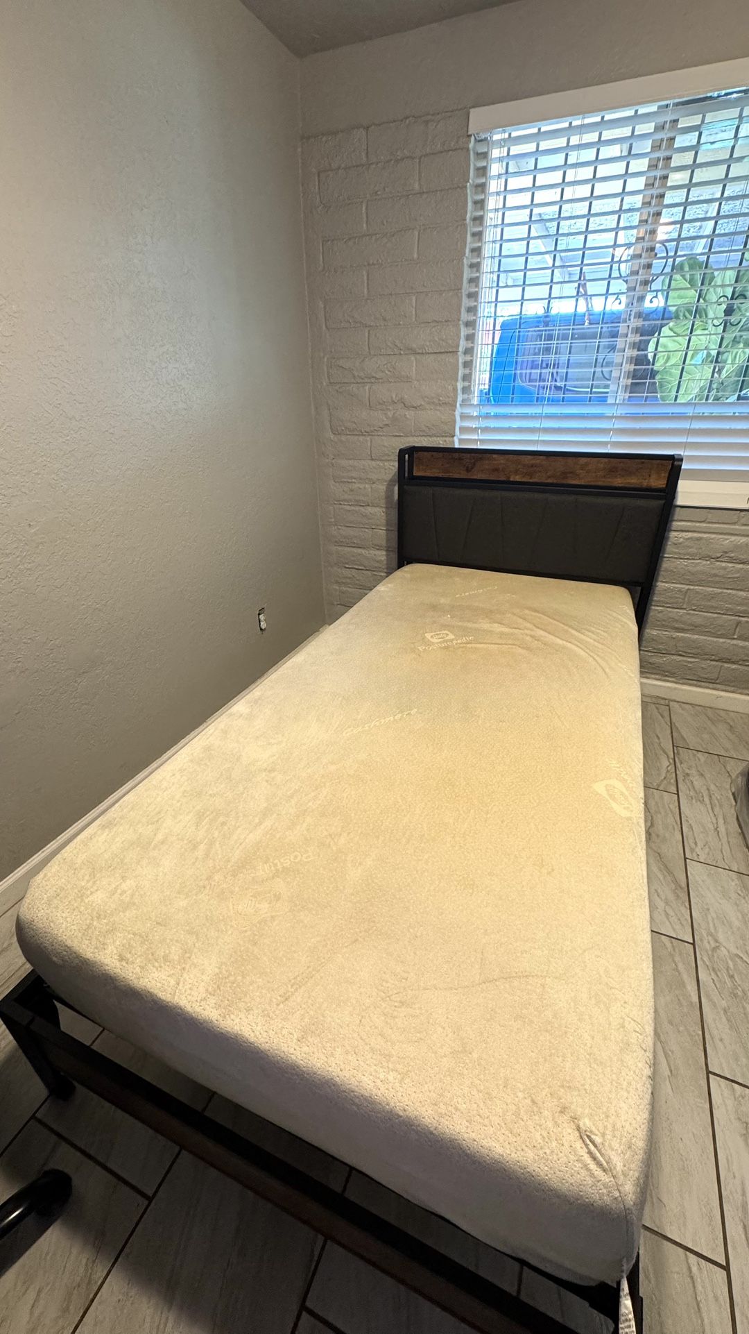 Bed Frame with Memory Foam Mattress Durable metal frame and mattress gently used Size Twin with charging ports USB Clean and ready to take Cama tamaño twin con colchón incluido Tiene para cargar electrónicos USB Limpio y listo para llevar