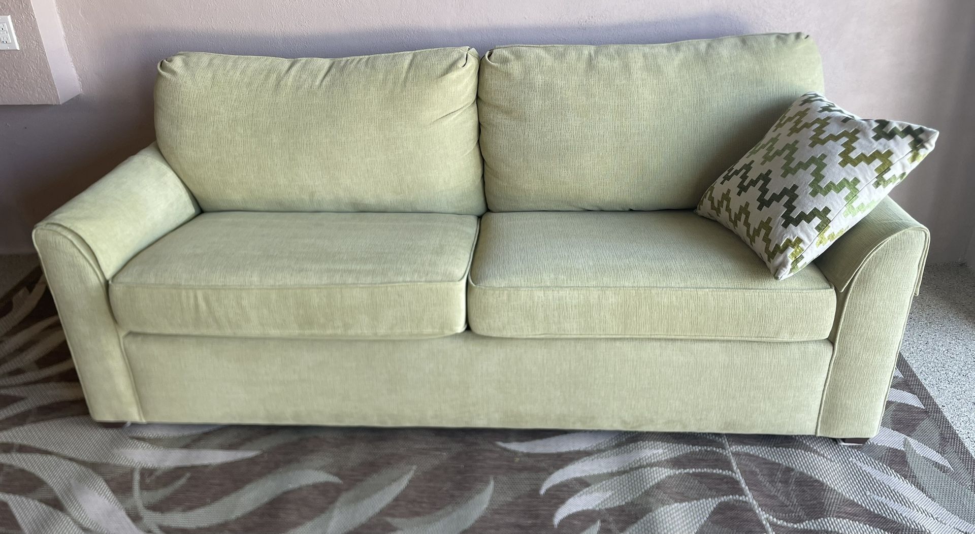 Queen size sleeper sofa in light green fabric. It comes with armrest covers to protect from stains. Dimensions: 81βx35βx30β Or about 90β in length when open. Delivery available locally for a fee π