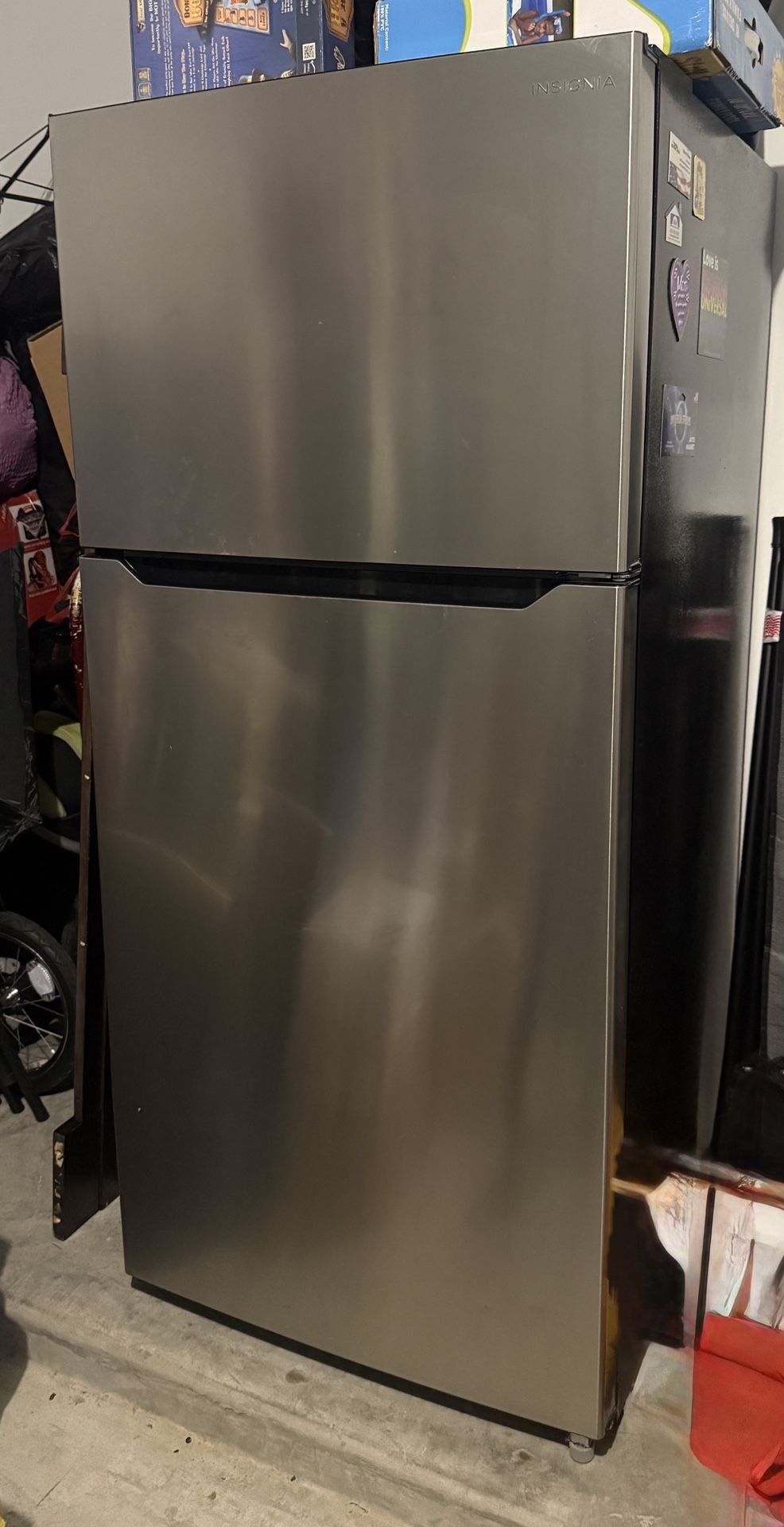 If you see it then YES ITS AVAILABLE . Don’t ask me if it is… BLOWS ICE COLD! Stainless Steel.. This sells for over $500. Make reasonable offer. Asking Only $297 OR BEST OFFER! Bought Brand New. Barely Used. Everything works 10/10. $297 (NO TAX). This can be placed in kitchen or garage so extra space. The Insignia 18 Cu. Ft. Top-Freezer Refrigerator has a separate top freezer compartment to store your frozen products and keep them organized on shelves or in the door trays. The fridge has three shelves to organize your food, with two that adjust to fit taller items. Door trays comfortably store your bottles and condiments, even 1-gallon jugs, and the humidity-controlled crisper drawers keep fruits and vegetables fresh. The refrigerator is also internally lit so you can find items easily. See less... 18 cu. ft. capacity Provides enough space for all your essentials and much more. Versatile placement A freestanding design with reversible doors provide flexible placement options. Separate top freezer Separate freezer compartment with a removable shelf and two door trays store frozen snacks, entrees and more. Optimal fridge storage Three glass shelves (one fixed and two adjustable), two humidity-controlled crisper drawers and two door trays in the refrigerator compartment help organize your items and keep your foods fresh. 5 adjustable door trays Comfortably fit taller items such as 1-gallon jugs, 2-liter bottles and more. Dairy compartment Offers an ideal storage place for small dairy items such as cheese and butter. LED interior lighting Illuminates the food in your refrigerator, making it easy to see the contents. Easy temperature control Adjust the temperature of your fridge from 34° to 50° F (1° to 10° C) or the temperature of your freezer from -11° to 10° F (-24° to -12° C). Frost-free design Provides outstanding frost maintenance with no need for manual defrosting. Recessed handles Creates a low-profile and understated look. Fingerprint resistant An added fingerprint-resistant coating grants easy cleaning that stays looking clean. Ice-maker ready Accessorize your fridge with an optional automatic ice maker in the freezer compartment (ice maker model NS-ICEF2W2 sold separately). Stainless steel design Looks great in any kitchen, matching the rest of your appliances.