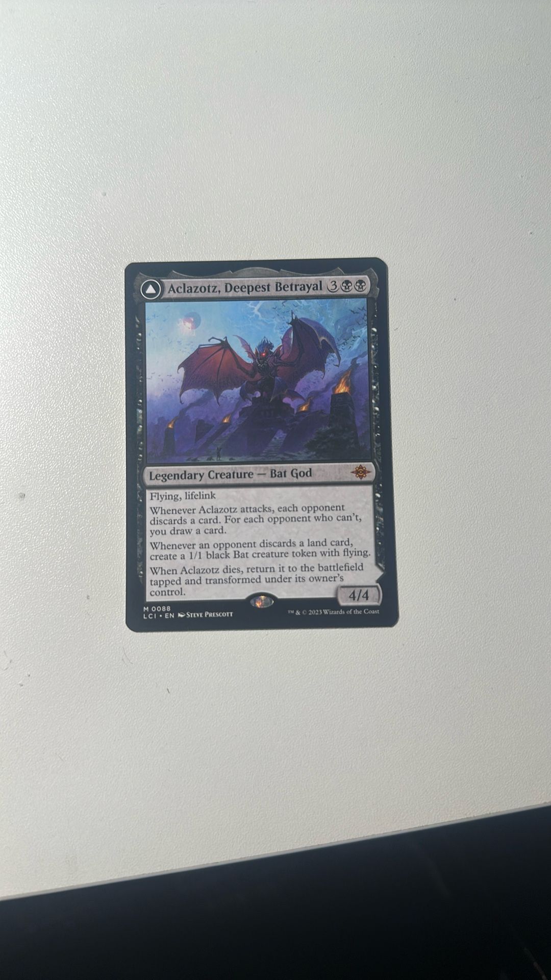 Aclazotz, deepest betrayal Lost caverns of ixalan mythic 0088 Nonfoil Description “Legendary creature - Bat God Flying, Lifelink Whenever aclazotz attacks, each opponent discards a card. For each opponent who can’t, you draw a card. Whenever an opponent discards a land card, create a 1/1 black bat creature token with flying. Whenever aclazotz dies, return it to the battlefield tapped and transformed under its owners control.” BACKSIDE “Temple of the dead Land (Transforms from aclazotz, deepest betrayal) Tap: add 1 black mana (2 any 1 black mana) ability: Transform temple of the dead (back into aclazotz). Activate only if a player has one or fewer cards in hand and only as a sorcery.” An interesting card for discard decks!