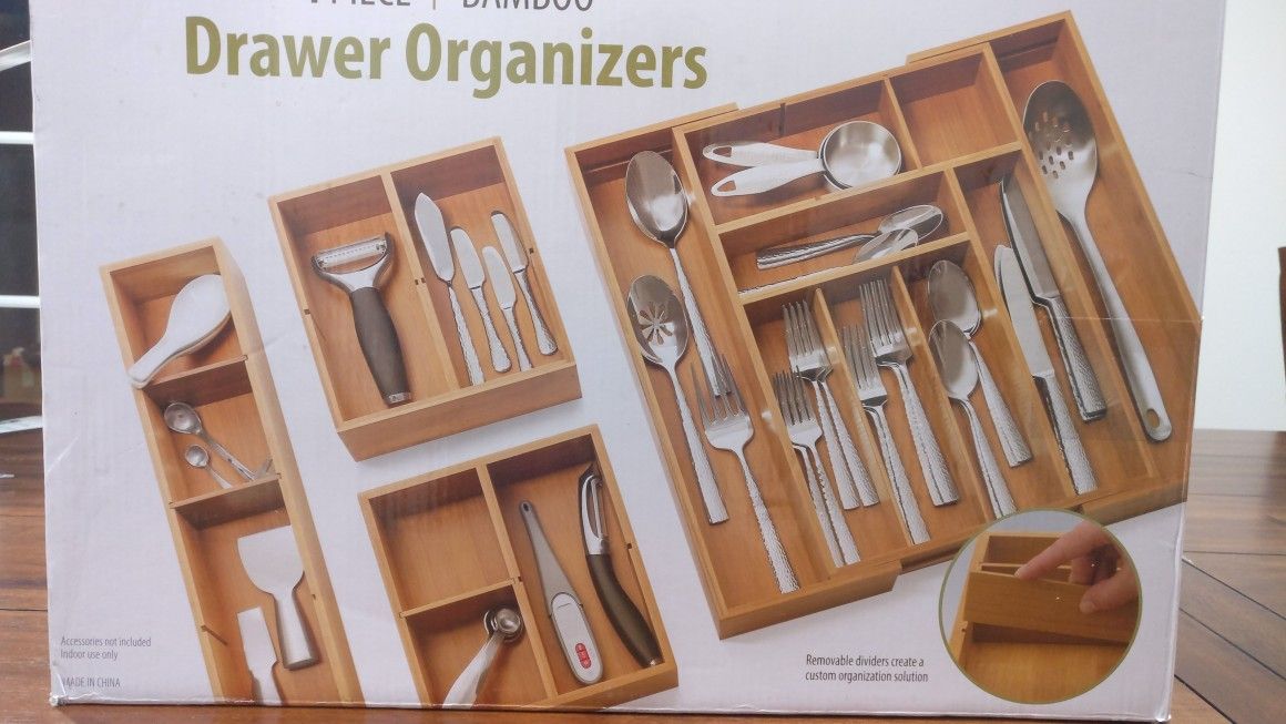 This item is available. Please send offer. 4 piece bamboo drawer organizer. L 17.5in x W 11.8in x H 2.5in Width expandable to 18.3in Non-skid protected feet