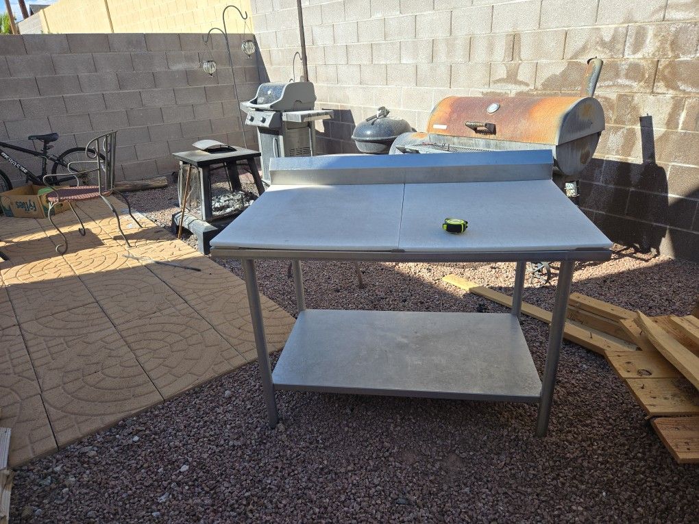 This table size is 4 ft long (48 inches) Width 30 inches Height 38 inches. This table can be used for multiple things such as preparing table serving table cutting table for a variety of things Meat, Bread, Deli,Fish Chicken etc This table can serve as a Muti purpose table