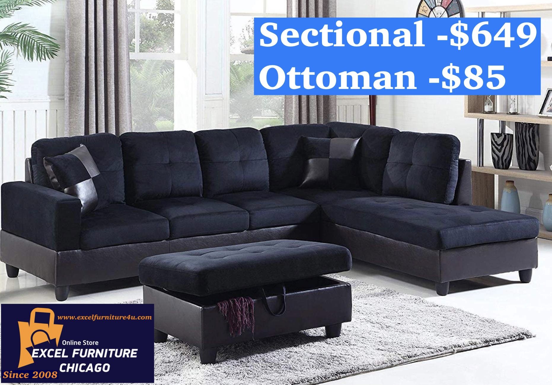 ORDER AND PAY UPON DELIVERY ( pay to the driver in your house) Check: excelfurniture4u. com $649–Sectional - 104 x 74 x 35H inch long $85–Storage Ottoman( optional) $75-Delivery ( possible the same day delivery) $809 total CASH or ZELLE on Delivery (Sectional,ottoman, pillows,delivery) We work in Chicagoland area & around ( Chicago, Rockford, Milwaukee) We deliver Customer pays upon delivery SOFA. COUCH. SECTIONAL.