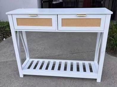 New in Box Console Table with 2 Rattan Drawers Entryway Table w/ 3-Tier Shelve White