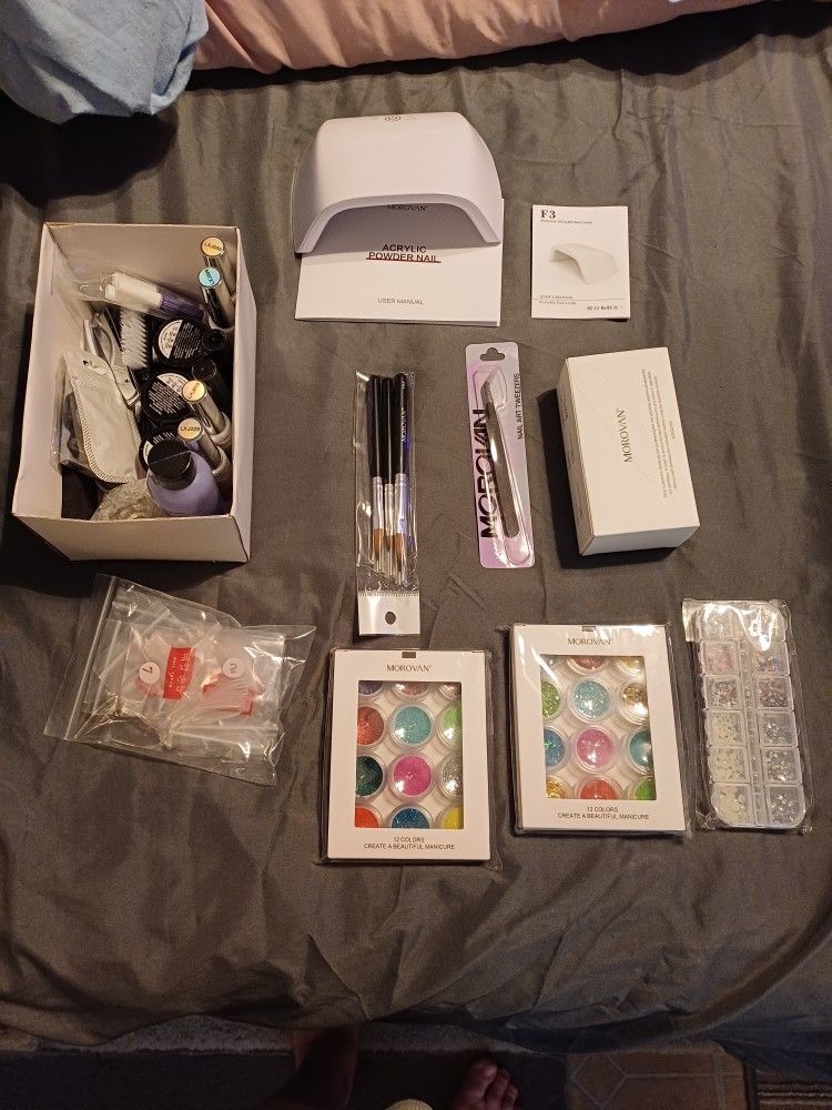Its brand new never used. Everything included. Nails, drill, nail polish, glitter, gel glue, and dryer.