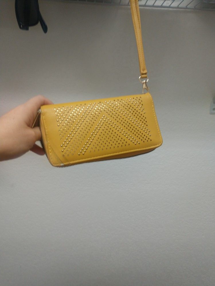 Wristlet wallet. Mustard color. Has a wrist strap. Corner wore off a bit this the price.