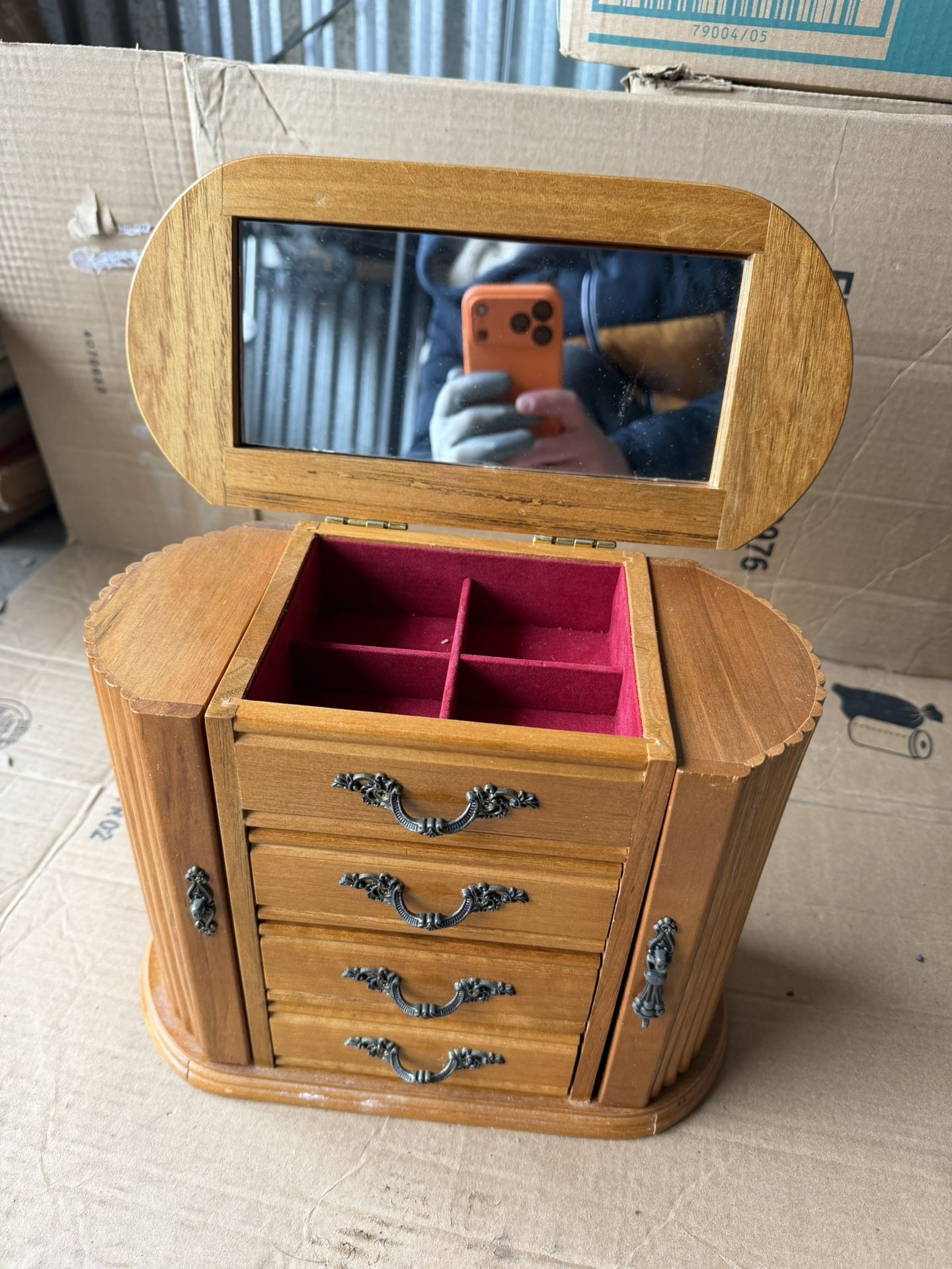 Vintage Wooden Jewelry Box with Mirror & Drawers