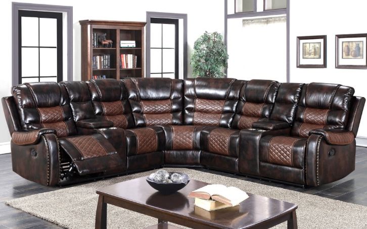 A large manually reclining sectional couch, with a beautiful brown and orange color. Leather gel material and a large seating capacity! For full price, please send message! We offer many options and similar items & colors. We also offer finance with three different companies (very little to no credit needed) We offer delivery and assembly services for little to no charge! We offer competitive monthly deals and sales. For any questions or inquiries, please contact us via messages!