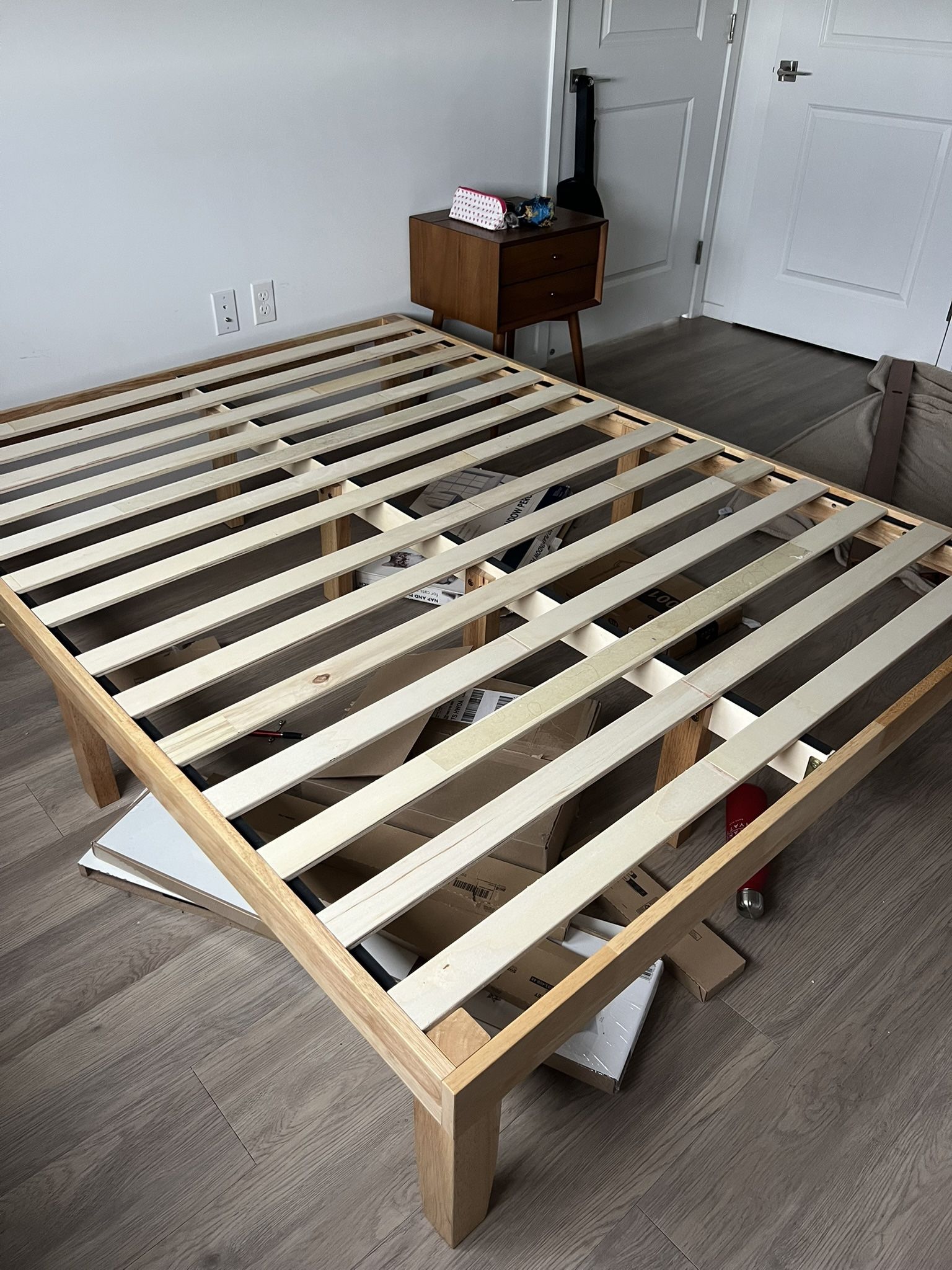 Light wood bed frame. Perfect condition. Can include mattress and sheets for extra $50 if interested.