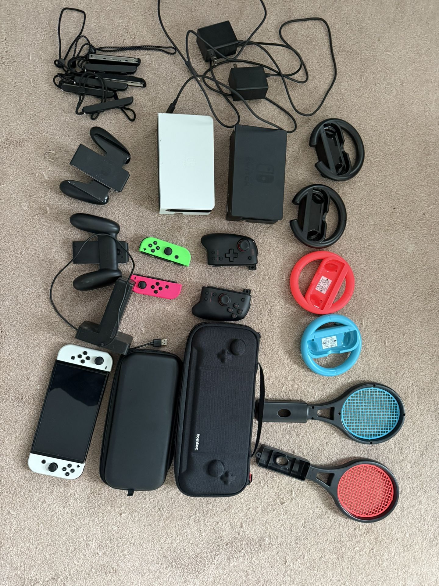 Comes with everything shown Switch oled, pro controllers, two extra controllers, multiple cases, two power adapters, two docks, Racing and racket accessories, and other items in picture Like new perfect working condition