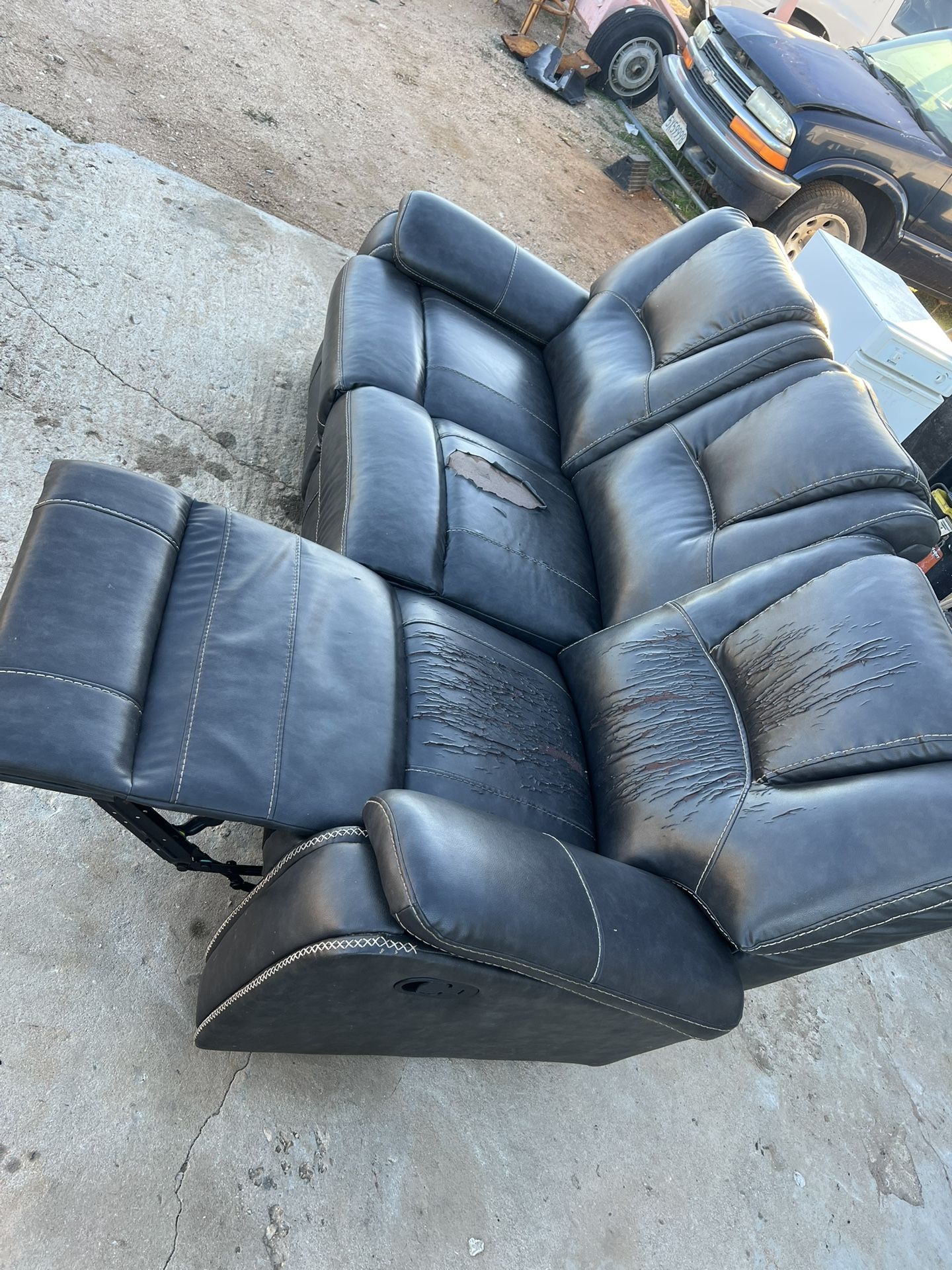 Selling a black reclining sectional sofa with working recliners. It does have some tears and scratches, but it’s still very comfortable and fully functional. ✔️ Recliners work smoothly ✔️ Cushions still supportive ✔️ Great for a TV room, man cave, garage, or starter furniture ✔️ Smoke-free home Condition: Used — has cosmetic wear (tears/scratches shown in photos)