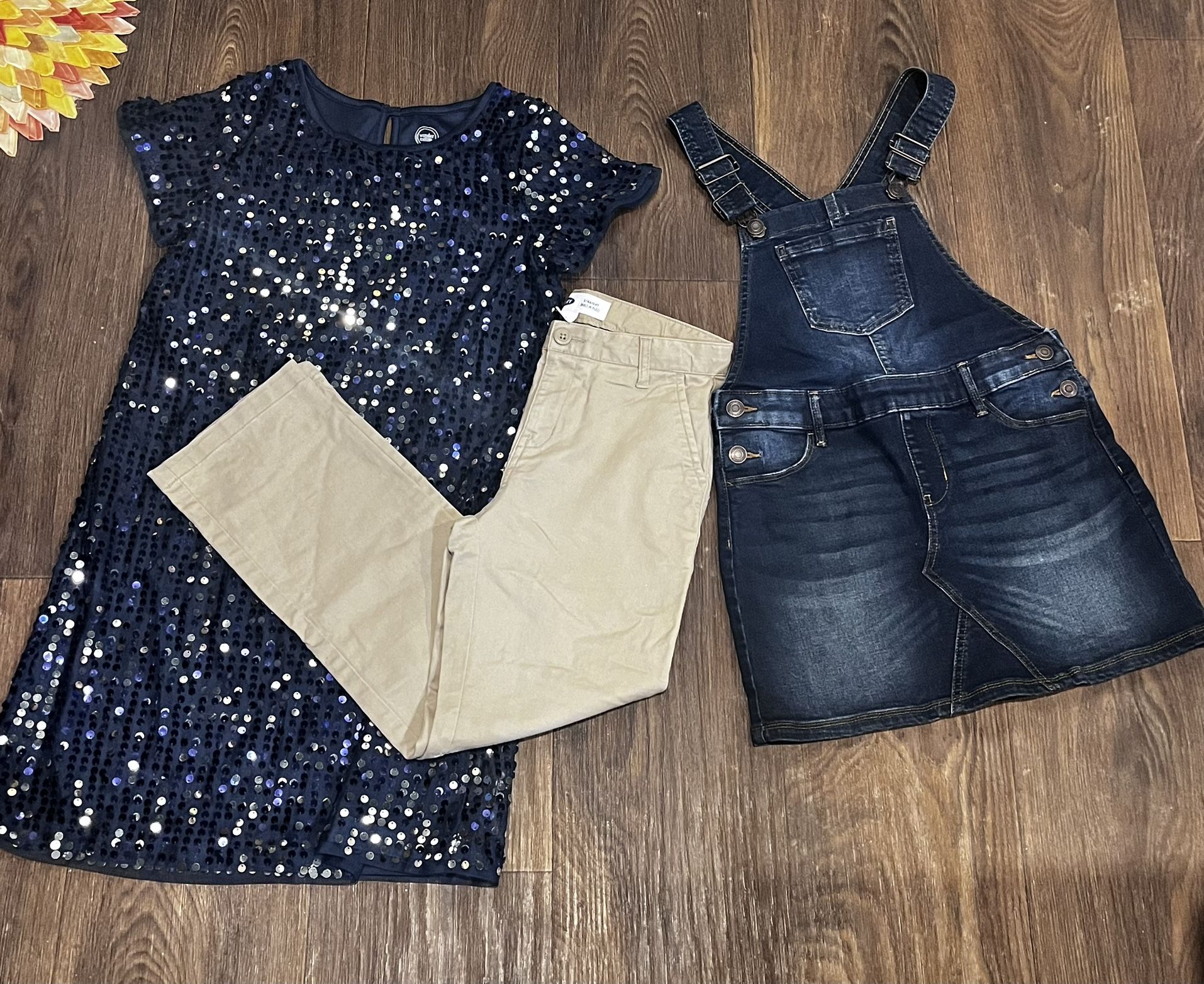 Size 10 lot includes denim overall skirt, khaki pants, navy blue sequin dress; all like new Old Navy SO Wonder Nation