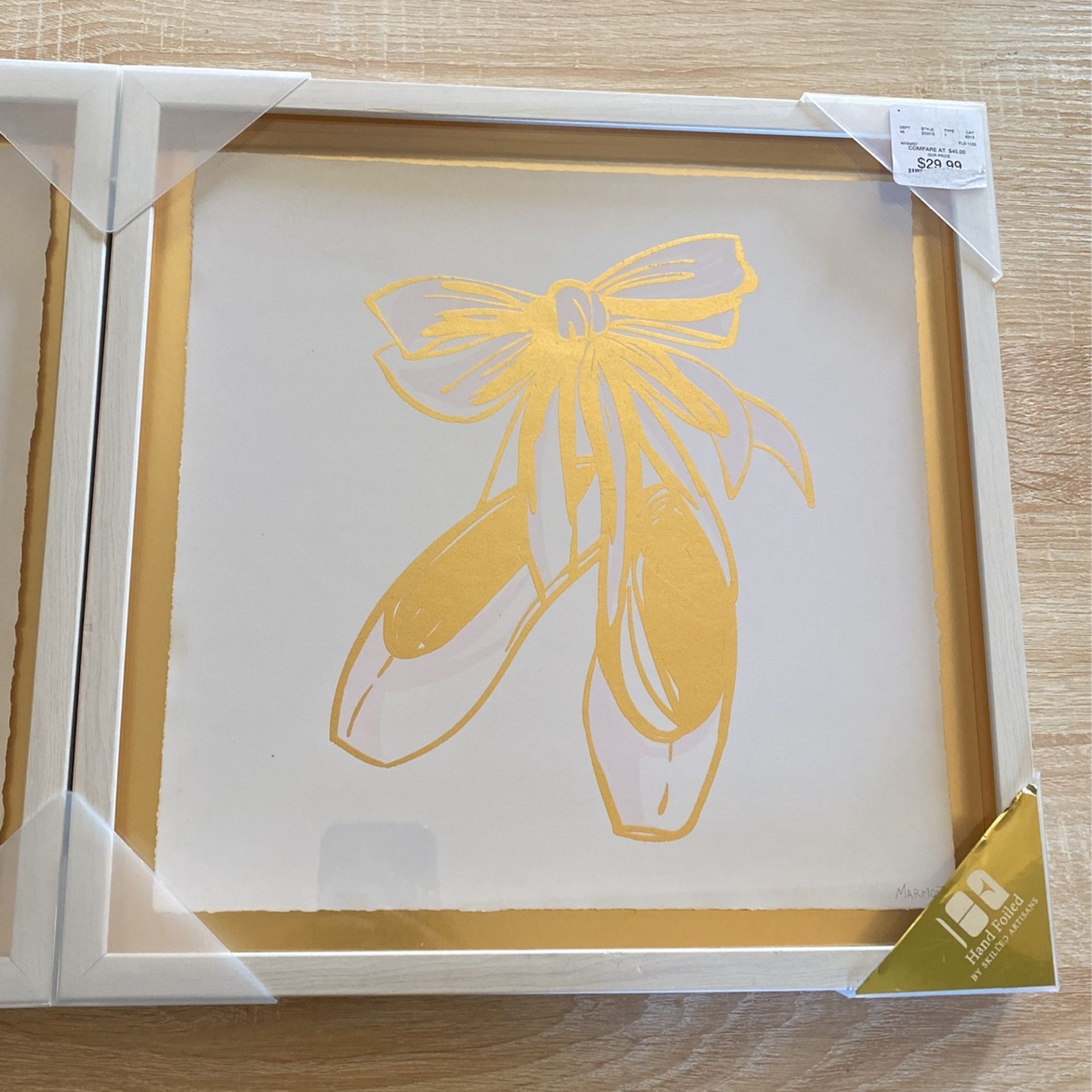 Brand new, hand foiled pair of art pieces. Ballet / ballerina themed with pastel pink and gold details. In elegant white frames. Perfect touch for any room!
