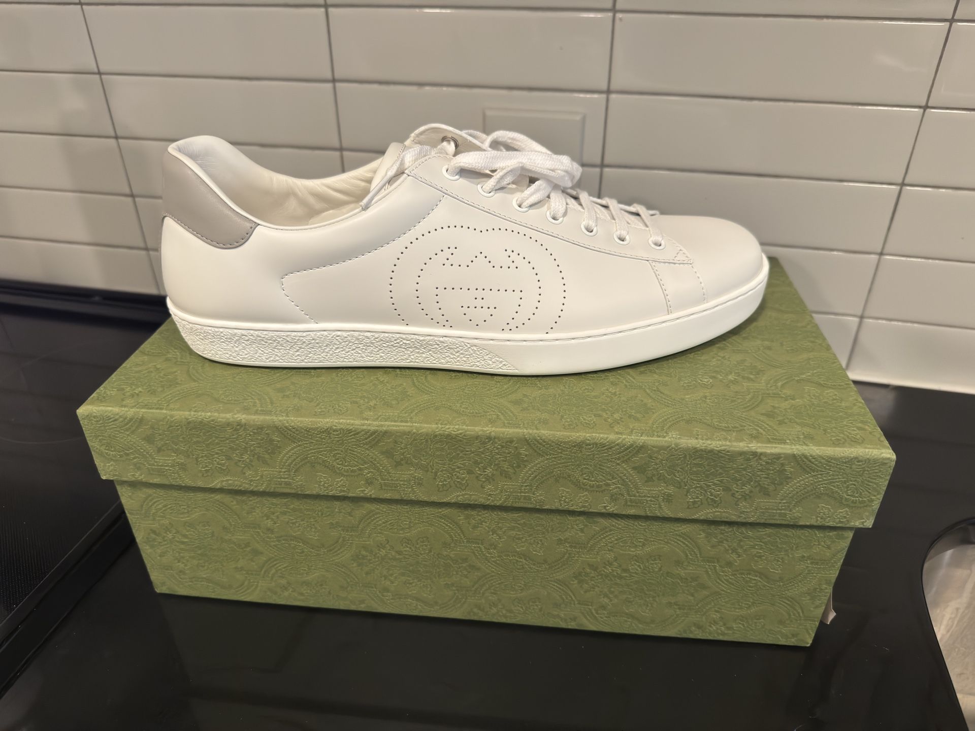 New Gucci Men's Ace White Leather GG Logo Low Top Lace Up Sneaker 599147 9094 never worn size 13.5