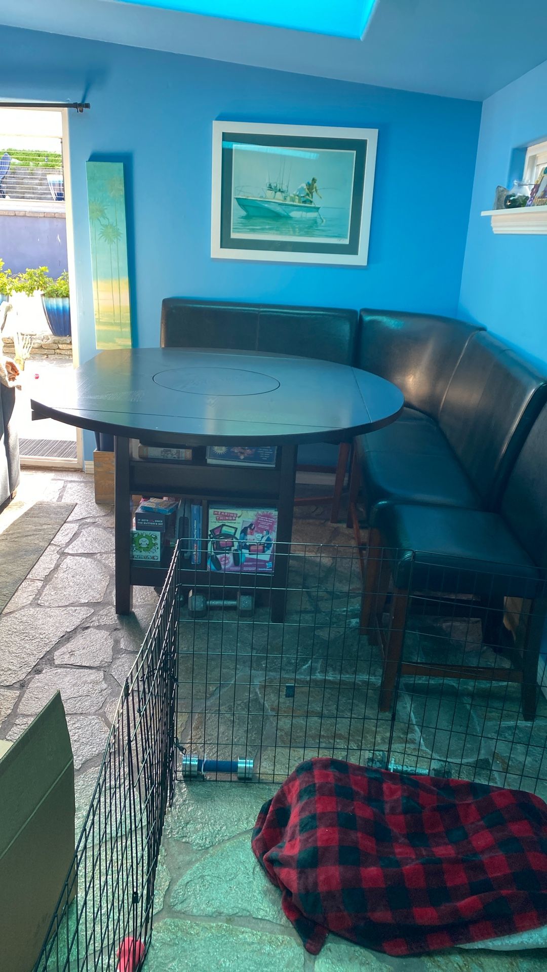 This table set up saves space great for a corner! Great for seating lots of children! Great place to spend time with family and friends playing games or eating! It has wine storage and multiple areas underneath for games and linen storage! Just been a wonderful piece for the youth of our family explanation! Our kids are grown and we need a different set up, but hope this can bring as much joy as we had! Small wears on the table, but most of the table looks new and has mostly been covered. Few wear in tears on the legs and bench seating has one area that needs to be fixed underneath the bench seating on one side. This could be a great poker set up as well for a garage or man cave! Also had lazy Susan in middle that works!