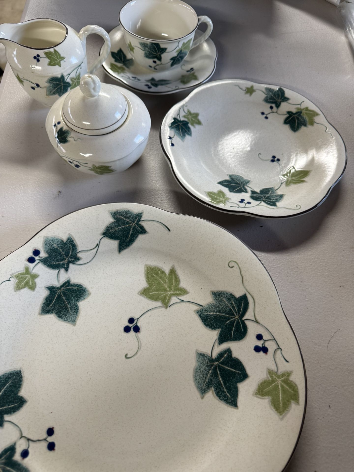 Set of 12 Mikasa timeless dinner plate, salad plate, soup plate, tea cup and saucer. Sugar and milk dish.