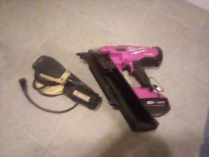 Milwaukee nail gun with 5.0 lithium battery n DeWalt sander