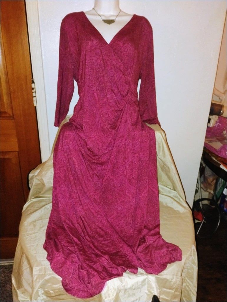 This elegant burgundy dress features a flattering v-neck and long sleeves perfect for any occasion the rich color as they touch to your wardrobe size large measurements 20 in from pit to pit soft surroundings measurement 16 inches in waist is stretchy material 53 in length