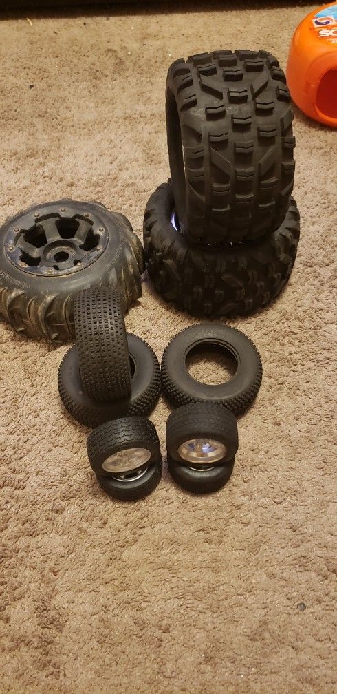 Selling this rc tures. Big tires are 14mm hex, used it on my emaxx i had. & the small one are 12mm for onroad car No sand paddles $20 for onroad 10 for big tures
