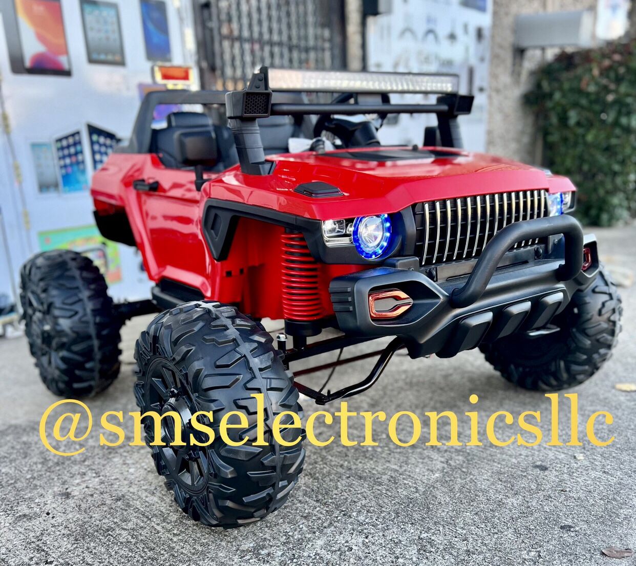 Leather quilted seats 12v Parental/Remote control Self control Available in Red and white Rubber tires 4x4 Converts into a 2x2 as well Built in music 2 seater