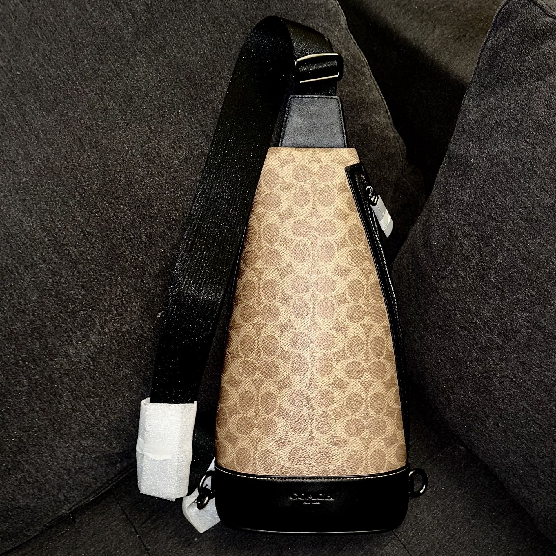 This is a brand new XL Coach men’s designer sling. There a back zipper compartment for a tablet and the main zippered compartment has the leather embroidered serial number identifier. Retail MSRP tag is US $480. This is the largest sling available.