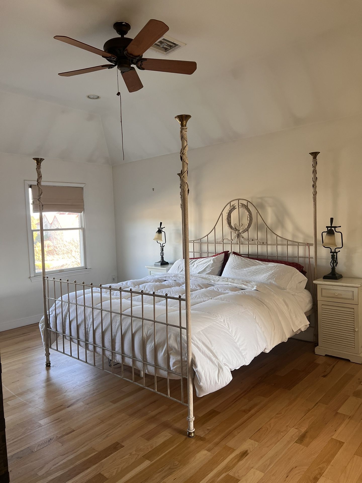 Made from wrought iron with a gridded form. The camelback headboard is centered by a large laurel wreath. Each long post is topped by brass torchiere over a leaf and vine wrapped motif. The bed rest on brass capped feet. ORIGINAL PRICE OVER $4000 Width - 78 in. Length - 86 in. Posts - 84 in. high
