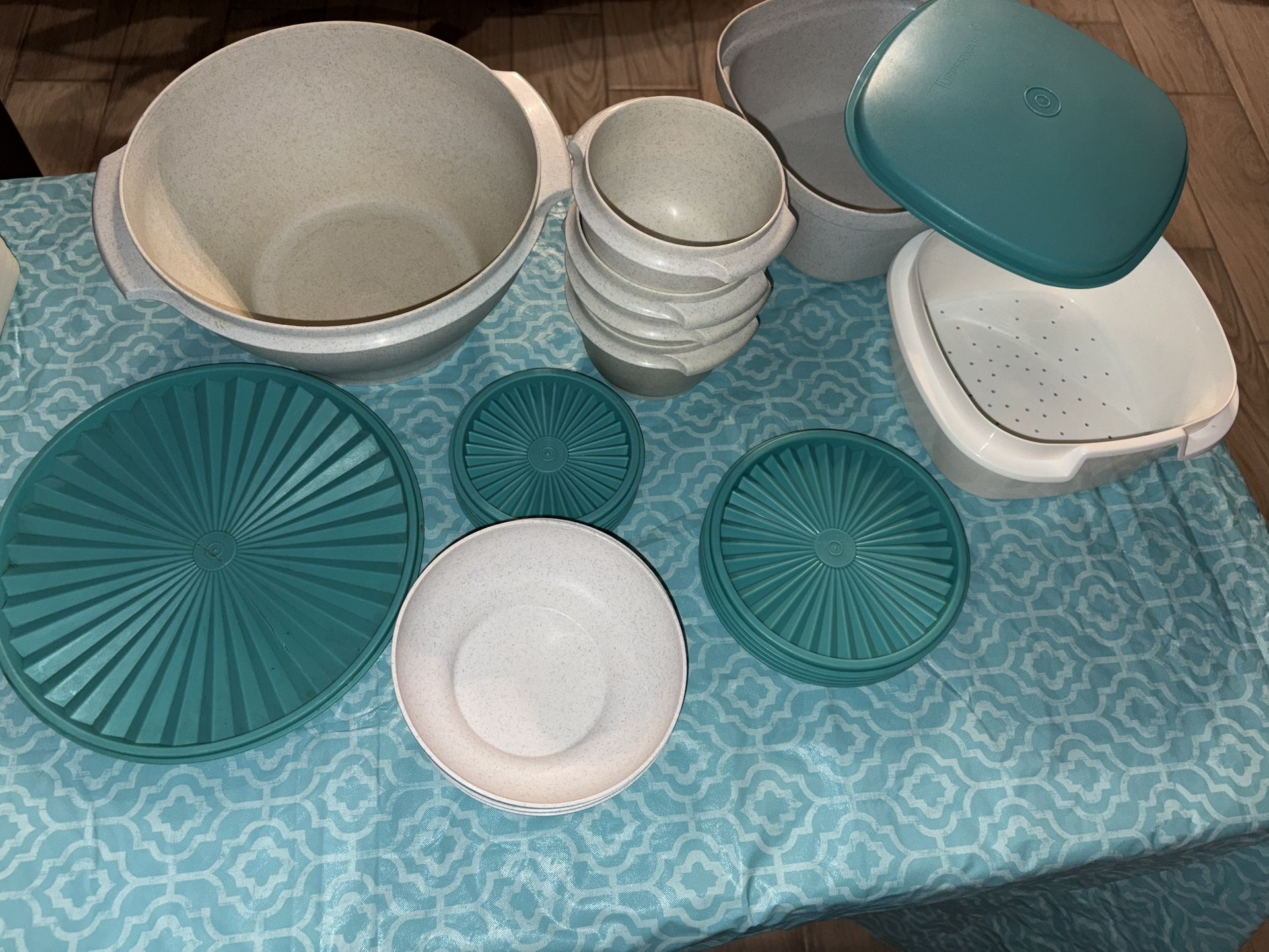 21 piece original Tupperware set used but in good condition … the only thing wrong is the big lid on the bowl is a little cracked in the center but still works just fine MPU NORTHEAST $35 OBO
