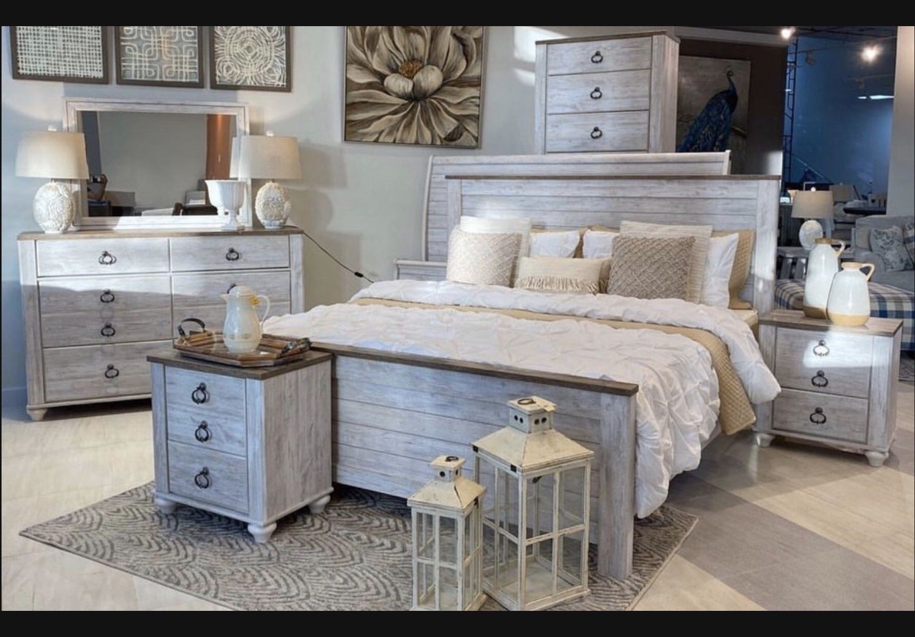 By Ashley Whitewash 7 Piece Queen Size Bedroom Set ☄️ Panel Bed( headboard,footboard,rails), two-2 drawer nightstand , 6 drawer dresser with mirror👌