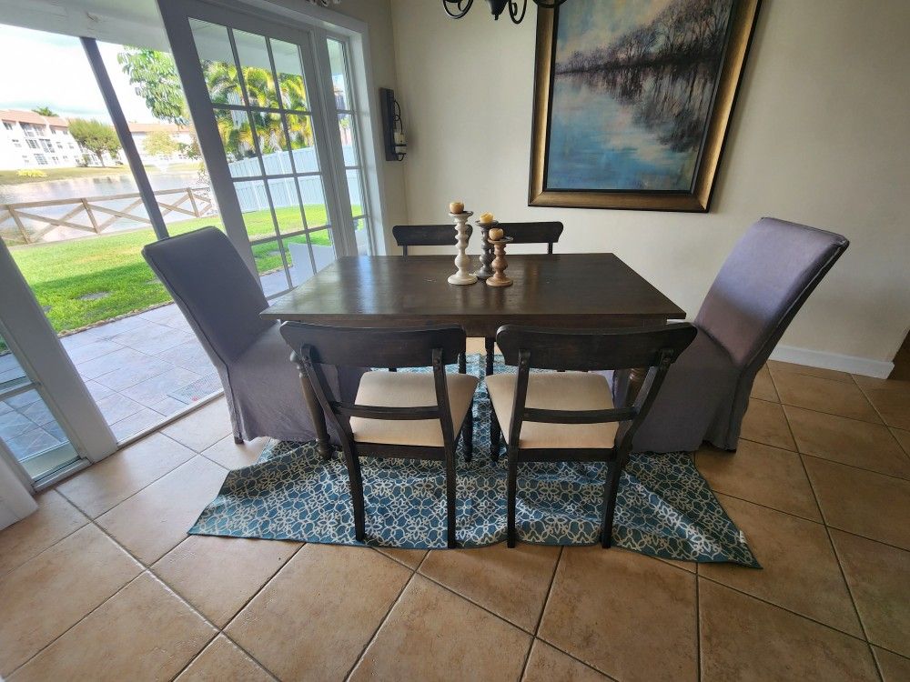 Approximately 60" long x 35" wide x 32" tall 4 black distressed wood side chairs with beige/linen upholstered seats (~18" wide seats) 2 gray slipcovered parsons/accent chairs at the ends Condition Table top has some scratching and wear, Chairs are structurally sound selling as a set $200 selling table only:$150 If selling chairs separately (set of 4 black): $80 Gray parsons chairs (pair):$60