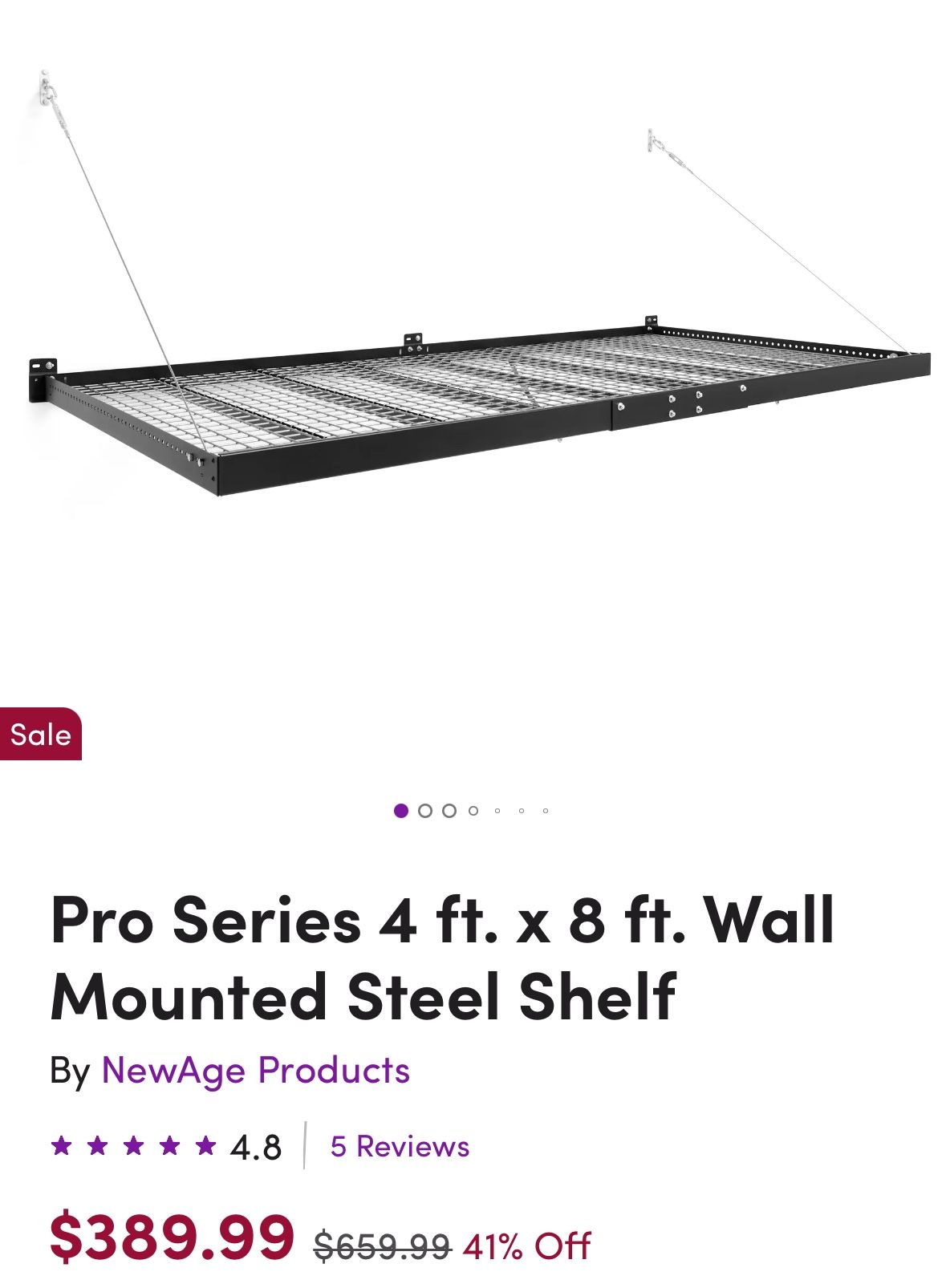 Pro series 4ft x 8 ft wall mounted steel shelves. I have 2 shelves brand new $150 a piece. After buying the shelves I realized they were too big for the space I have. I bought the size down and have no use for these. Price is firm and way below retail. Garage shelving