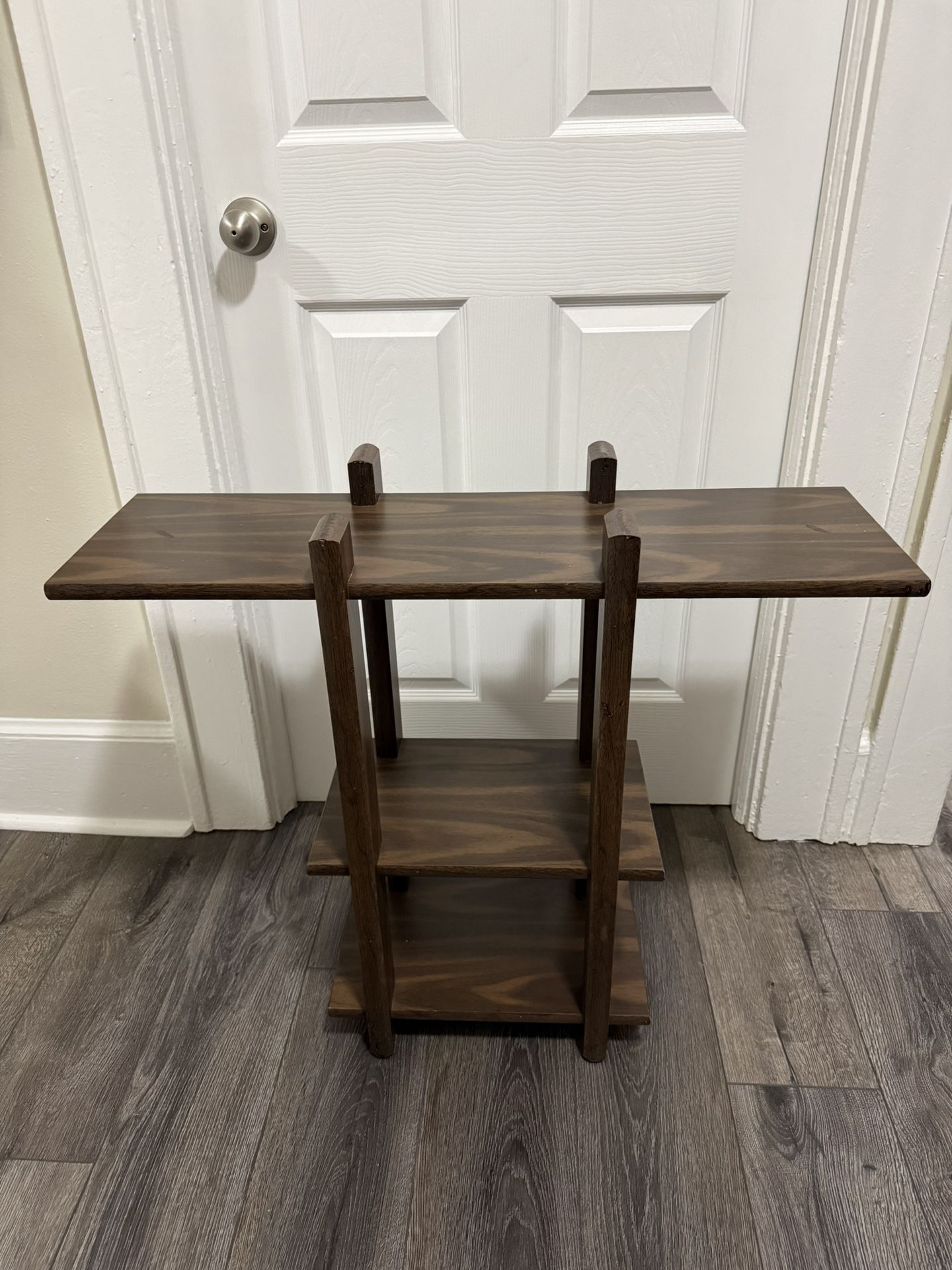 25.5”Hx31.5”Wx 9.5”D. Pick up in Harrison Nj. Timeless two-tier dark wood side table for sale. This piece is perfect as an end table, bedside nightstand, or stylish plant stand, featuring sturdy turned wood supports and a beautiful dark finish. It is in strong, sturdy vintage condition with only minor, age-appropriate wear that adds to its character