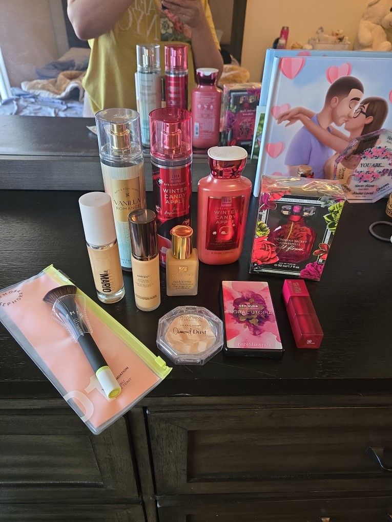 Unused makeup products and Fragrance! Makeup by MARIO, ESTEE Lauder, Hour Glass foundations with Sephora make up brush! There are fragrances by Bath and Body Works and Victoria secret that all smell great! There's Physicans formula highlight, Maybelline lipstick, and Bare Minerals eyeshadow pallete. These foundations are medium complexion.