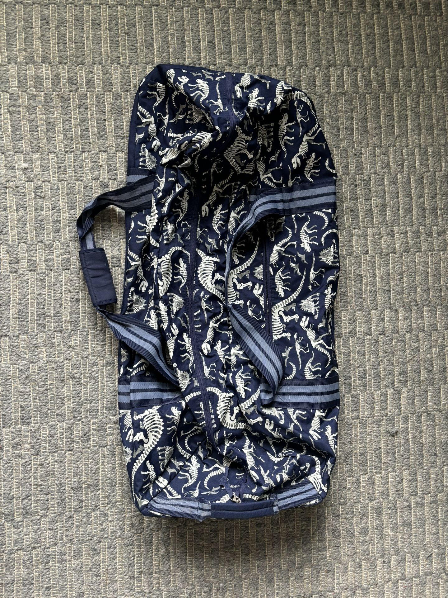 Glow in the dark dinosaur print duffle bag. Soft shell. Has wheels. Good large capacity.