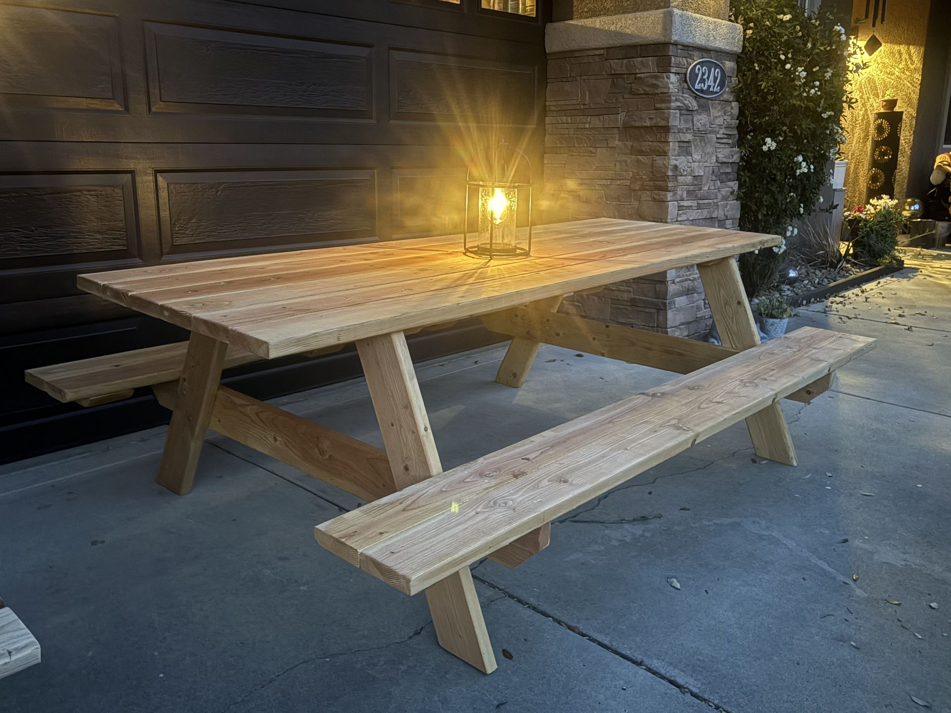 Summer sale! $100 of ready to go tables! Extremely high quality custom picnic tables loaded with extras. Our standard size table is 8 feet long and 66 inches wide approximately, 31.5 inches tall. We welcome custom orders for other sizes! Standard tables include premium kiln dried Douglas Fir wood. All tables are glued, screwed and bolted, holes are filled in with putty and tables come with clear oil fortified exterior sealer unless you would like them bare to stain yourself. All wood has a chamfered edge so no sharp corners. We sand and router all tables for that extra touch, already included in the price! These are very heavy duty, very high quality tables that are built by a local craftsman to be enjoyed for many years to come. Tables are extremely heavy and all have been reinforced with added supports. Standard 8 foot tables are $575 with all the extras. Staining is an additional charge, please inquire if interested. We have some available now, if you would like one quickly! Other sizes can be custom ordered, please inquire about pricing if you would like something different.