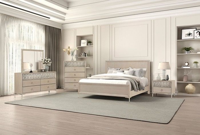 NEW IN BOX ASSEMBLY REQUIRED INCLUDED: BED FRAME, ONE NIGHTSTAND, DRESSER, DRESSER MIRROR MATTRESS NOT INCLUDED QUEEN 4 PC SET $1899 EASTERN KING 4 PC SET $2299 Dented Stainless Steel Accents UV-Sealed Drawers Felt-Lined Top Drawer Cedarwood-Lined Bottom Drawer French Dovetail on Drawer Front English Dovetail on Drawer Back Ball-Bearing Glides