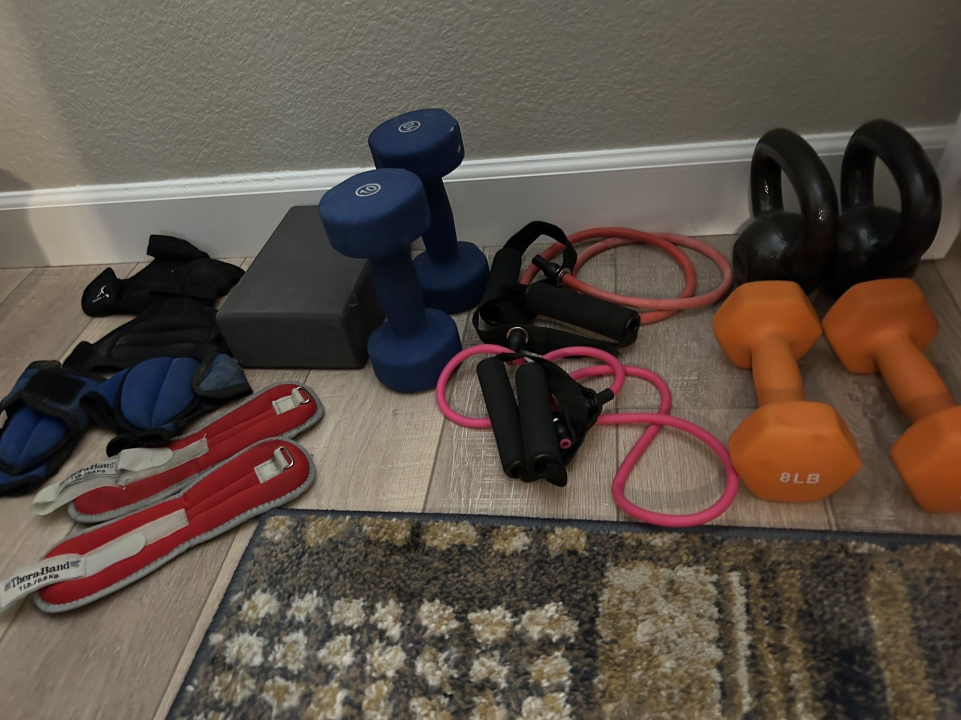 1 pair of 8lbs each, 1 pair of 10lbs each, 1 pair of 10lbs kettle bells, yoga block, 2 stretch ropes and various wrist & ankle weights.