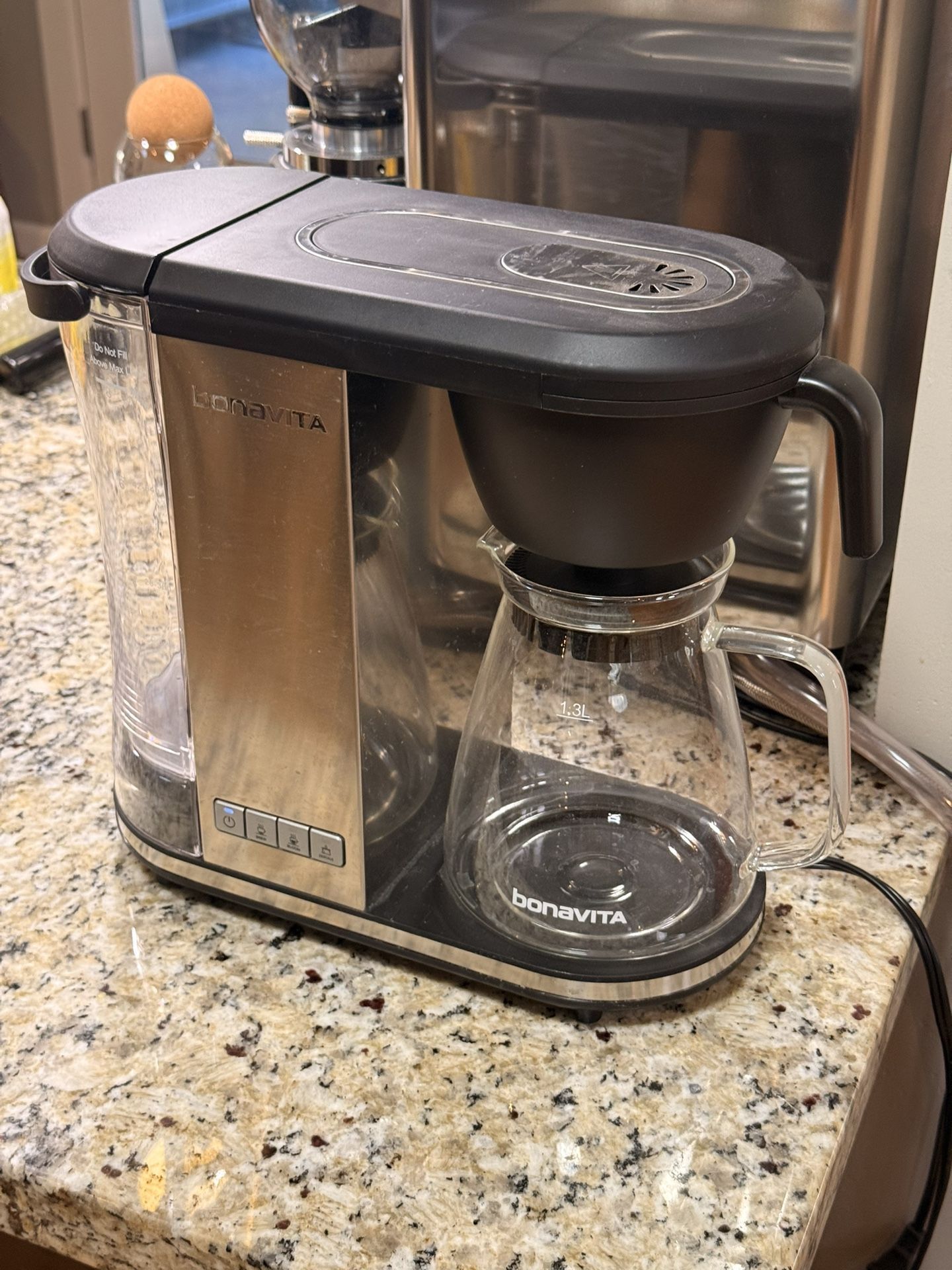 Bonavita Enthusiast 8-Cup Coffee Maker, Glass Carafe Model BV2201GS Like new, unused coffee Bonavita Coffee Maker, in Stainless Steel Finish, with tempered Glass Carafe. Makes 8 cups in 6 minutes. I thought my other coffee maker was broken, and got this to replace it, but I was able to get it working again. Easy Pickup in Phoenix near Camelback and Central. Powerful 1500-watt boiler. Removable water tank. Optional pre-infusion mode. Showerhead design for even extraction. Flat-bottomed filter basket. Tempered glass carafe with comfort handle. Glass carafe, carafe lid, filter basket, and showerhead are dishwasher safe and all plastic is BPA-free. Easy pickup in Phoenix near Camelback and Central.