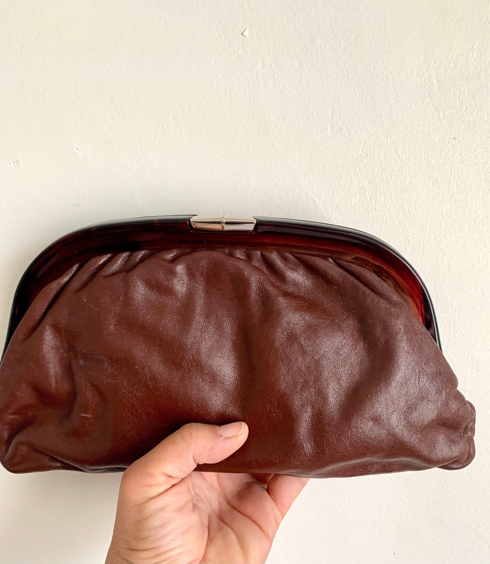 Vintage 1970s Margo’s Maroon Clutch With Lucite Handle. Sweet little maroon leather (faux) clutch with lucite type plastic and gold plastic closure. Interior lined in gold colored vinyl material. Made in Italy.