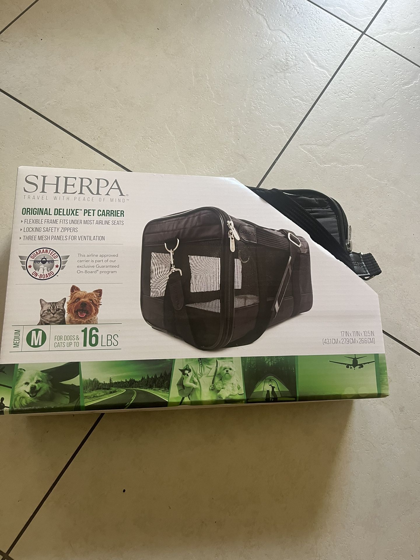Brand New never used Original Sherpa Pet Carrier medium up to 16 pounds. Dimensions 17 in x 11 in x 10.5 in. Great for traveling.
