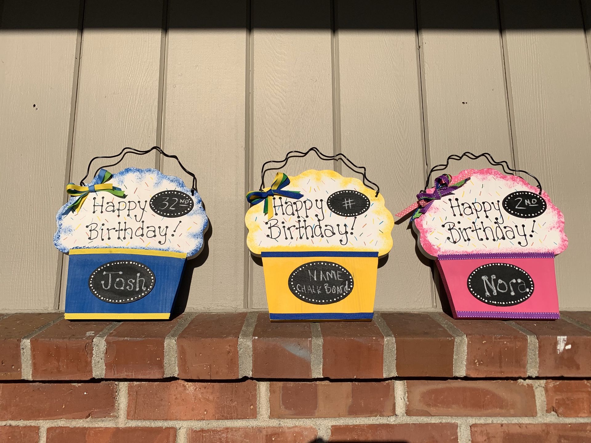 Hand painted cupcake birthday sign. Chalkboard let’s you personalize and use over and over again. $25 each 11 1/2” x 11” Reasonable offers considered.