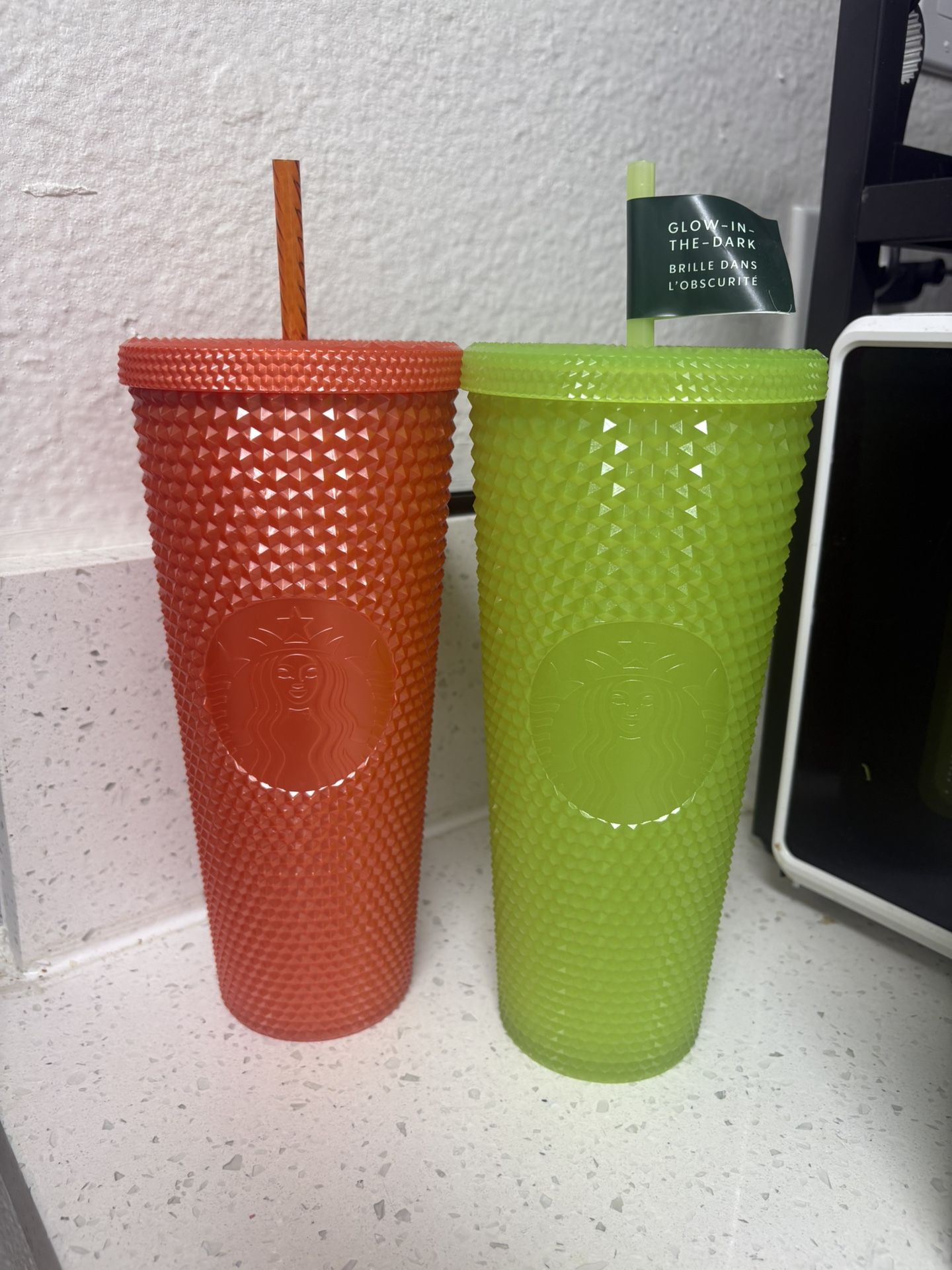 New Starbucks Cups Both studded Green one is glow in the dark Bundle $30 Green $20 Orange $15 Local Pick up Sherman oaks near Burbank/kester