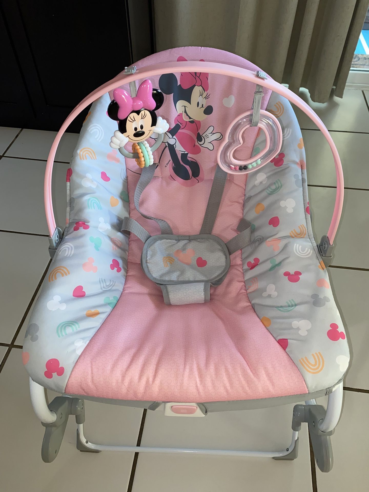 Gently used, hadn’t been used in a year. No rips or stains! Smoke free home. 62.5% Metal, 24.7% Plastic, 12.8% Polyester Infant to Toddler: Get years of use with everyone’s original bestie Minnie Mouse! The magical Infant to Toddler Rocker seat transforms from a baby rocker to a toddler seat as baby grows (up to 40 lbs) Vibrating Baby Rocker: When you need a second set of hands, this seat comforts your baby girl or boy with soothing vibrations. Powered by one C battery. 5-Point Safety Harness: Keep baby snug and secure with the 5-point harness for added safety. The rear kickstand and slip-resistant feet additionally help keep the seat secure for newborn and up Removable Toy Bar with 2 Toys: Introduce interactive play with the Minnie Mouse bead chaser and colorful star rattle. Remove the toy bar so you can get baby in and out easily. Full Body Recline: The seat features 2 recline positions to hold baby just right. Assembled dimensions 22.83" (H) x 20.28" (W) x 28.54" (D). To clean, remove the seat pad and wash with cold water on gentle cycle.