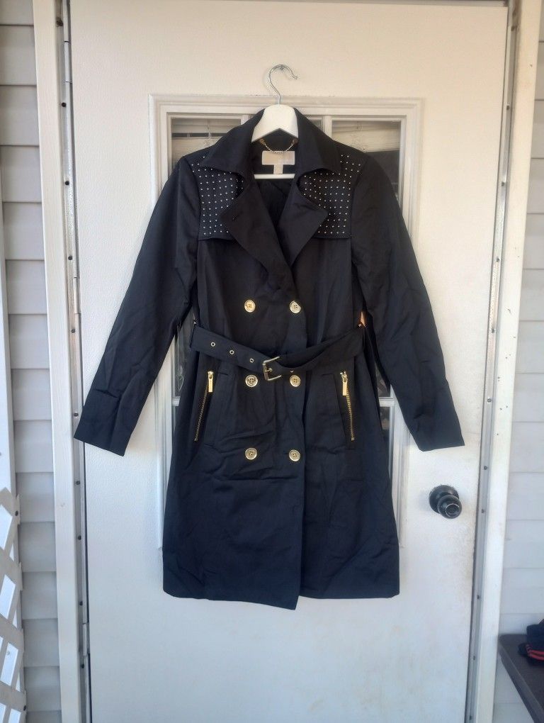 Michael Kors women's Black with Gold accents trench coat size XS. In good condition no rips or tears just need a little cleaning since it has been in my storage for a couple months. Measurements laying down flat Length 37" Pit to pit 16" 1/2 Waist 16" 1/2 See all pictures for more details.