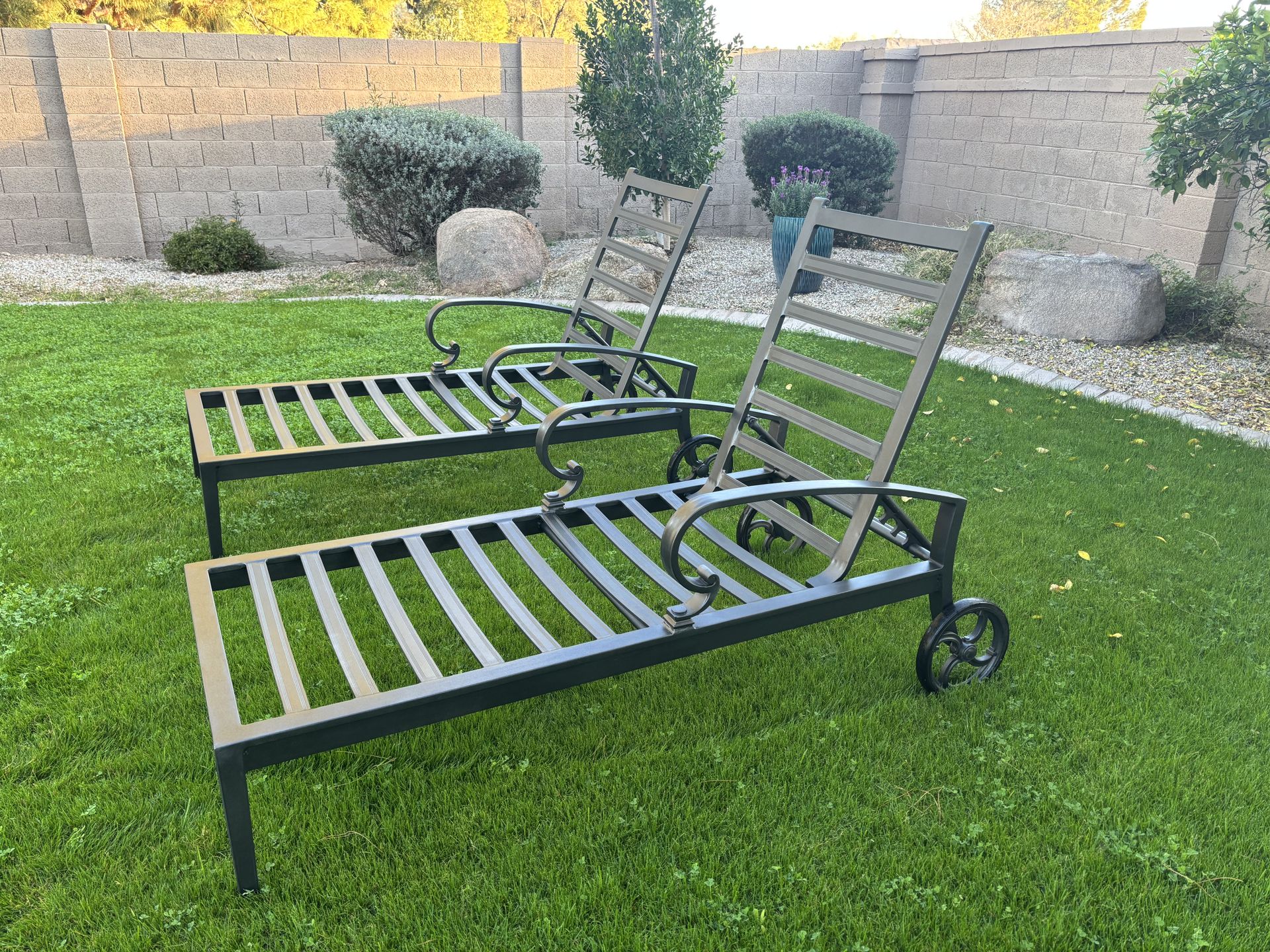 I’m selling a set of solid aluminum chase lounge chairs on wheels. These are beautiful outdoor lounge chairs in excellent condition. They have multiple lounge settings and are perfect for the patio or pool. Cushions are included. No rips or tears. $400 for the set. Cash only. Pick up near Ray and Kyrene in South Tempe.