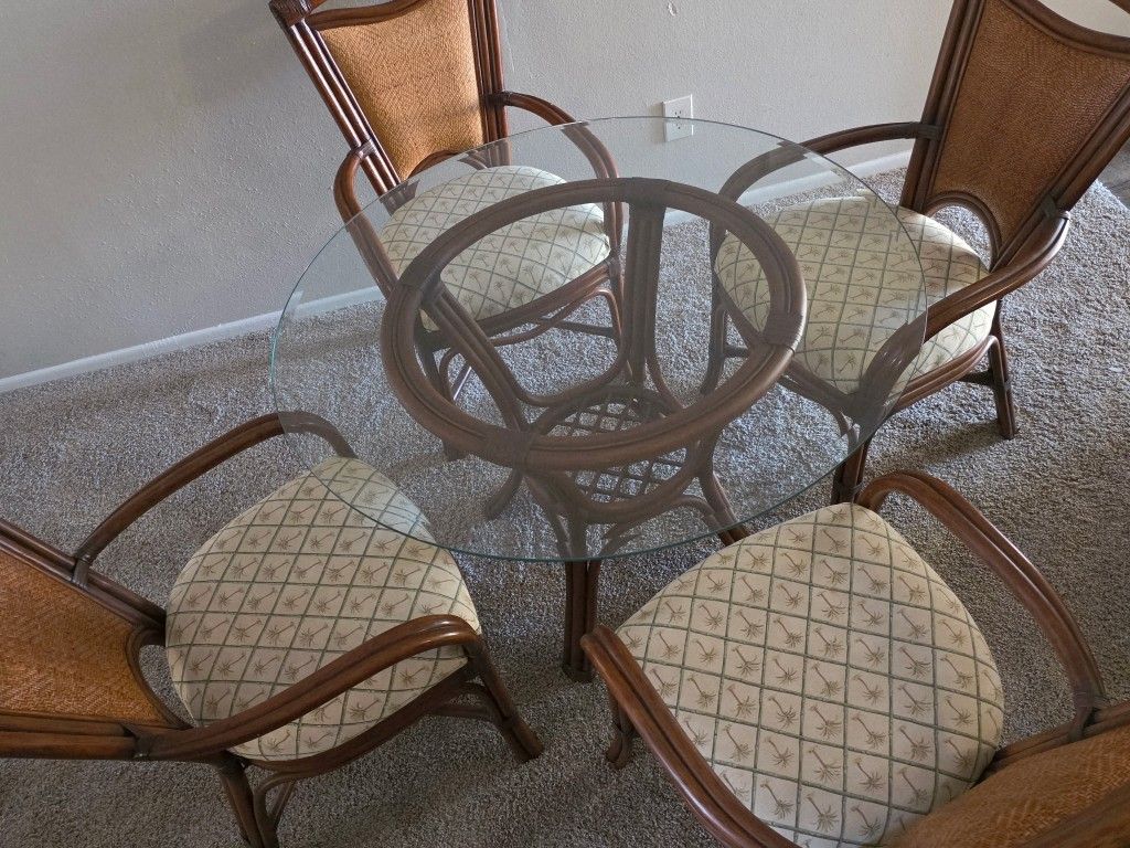 Fcfs. This is a Rattan Indoor 6 Piece Dining Set with arm chairs and a glass top table. The set features handwoven rattan over reinforced frames and includes plush, tailored seat cushions. In great condition.